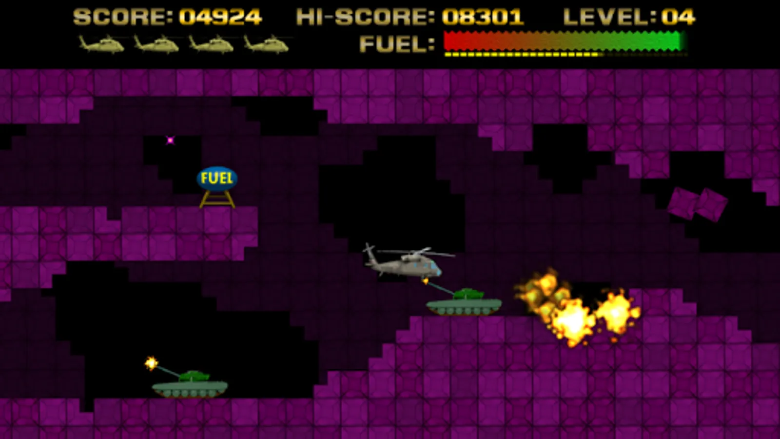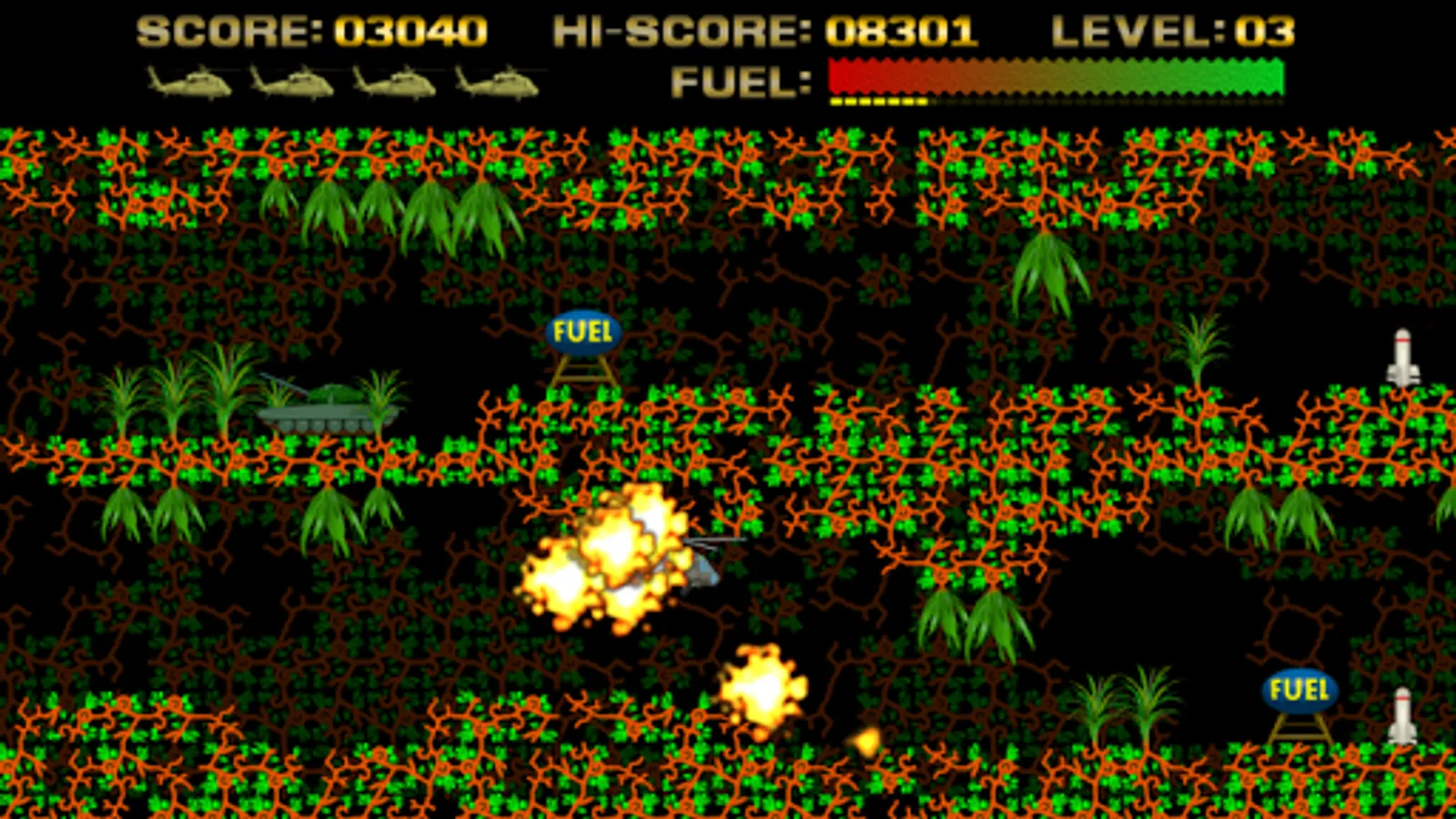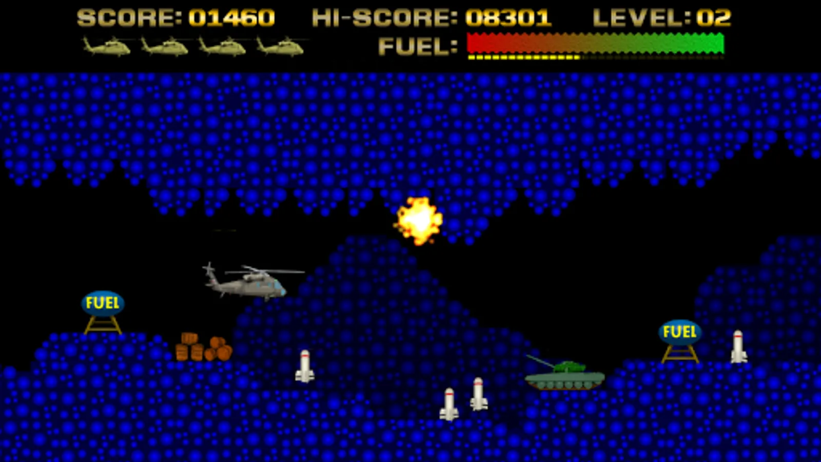 Control a helicopter and has to guide it across a scrolling terrain, battling obstacles along the way. The ship has a limited fuel supply, which is depleted over time. More fuel can be acquired by approximation fuel tanks in the game.