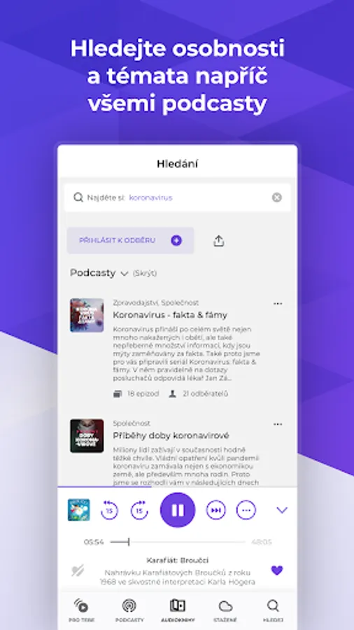 Vyhledejte si jméno osobnosti nebo téma a dostanete aktuální playlist epizod napříč podcasty.