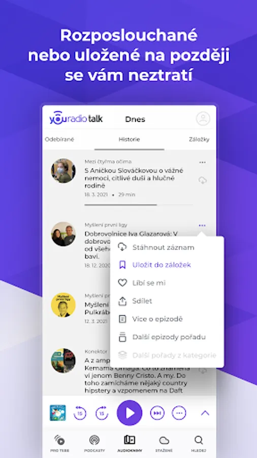 - stáhnout epizodu do telefonu a přehrávat bez internetu,