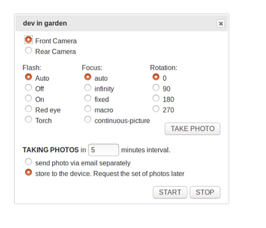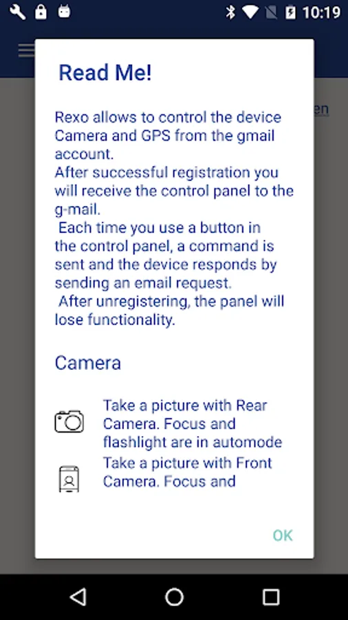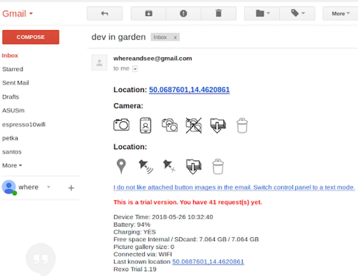 Rexo allows to control the device Camera and GPS from the gmail account. After successful registration you will receive the control panel to the g-mail. Each time you use a button in the control panel, a command is sent and the device responds by sending an email request.