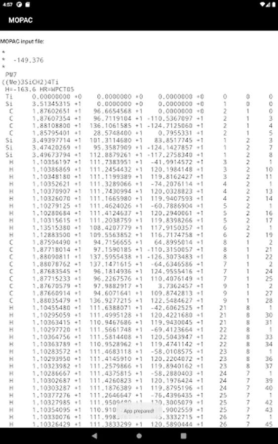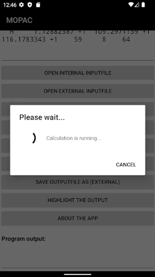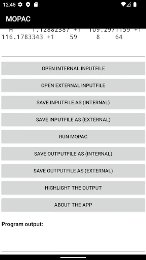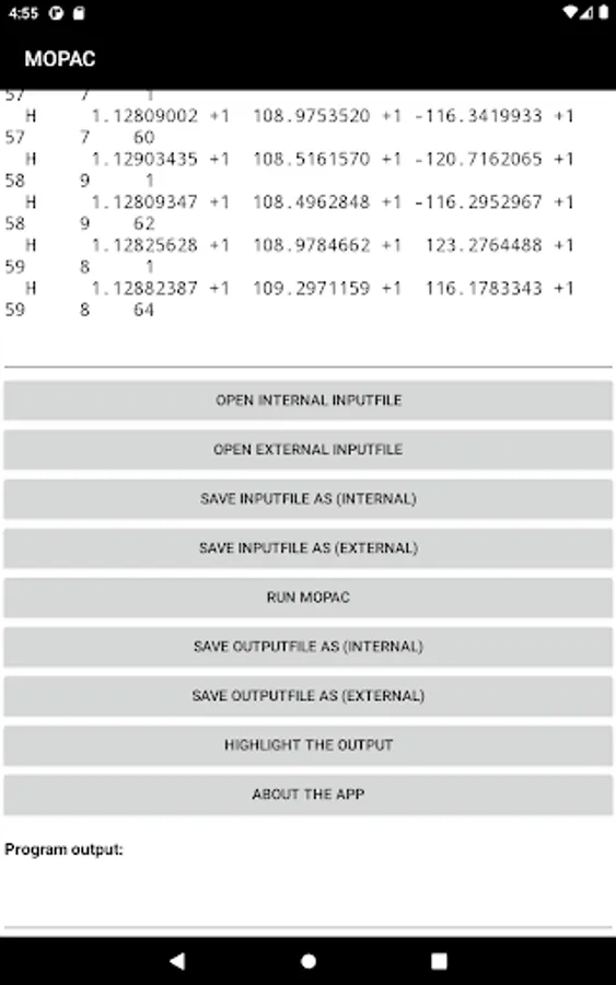The current package contains MOPAC 2016 binaries compiled for the particular Android hardware platforms and adapted for running in generic, stock devices. The app requires permission to access the file-storage. It works completely offline and does not contain ads. The app does not collect any kind of personal information.