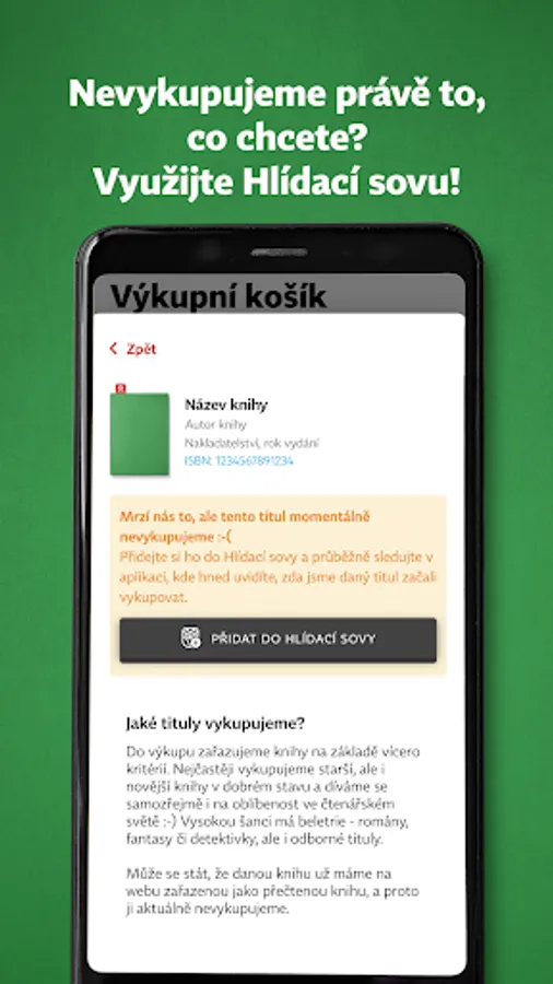 Scan all the books in your library, and thanks to the Watchful Owl feature, you can also save the books that we are not currently buying to the list. If we start redeeming these books, you will know about it immediately after opening the application, and you can conveniently move the books to the redemption basket.