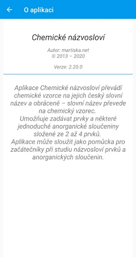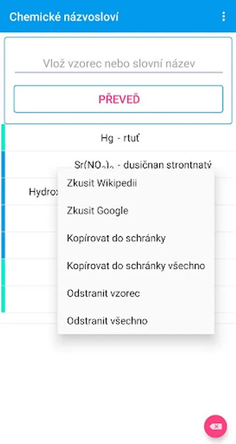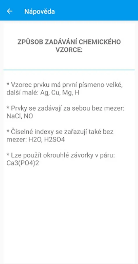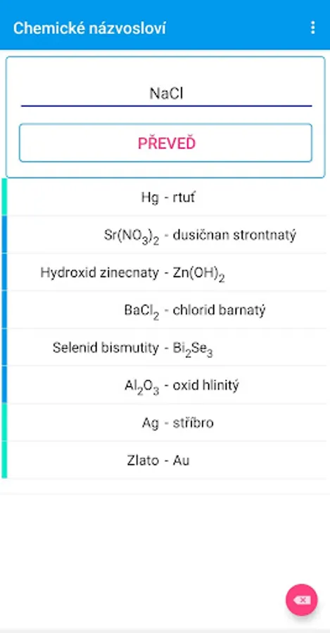 The Chemical Nomenclature application converts user-entered chemical formulas to their Czech word name and vice versa - converts the word name to a chemical formula.