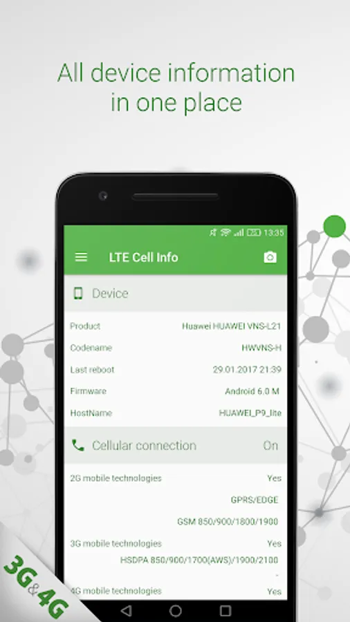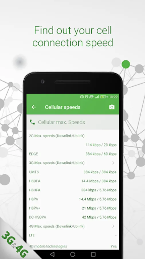 • Detect mobile generations and standards supported by your device (2G, 3G, 4G, GPRS, EDGE, UMTS, HSPA, LTE, VOLTE).