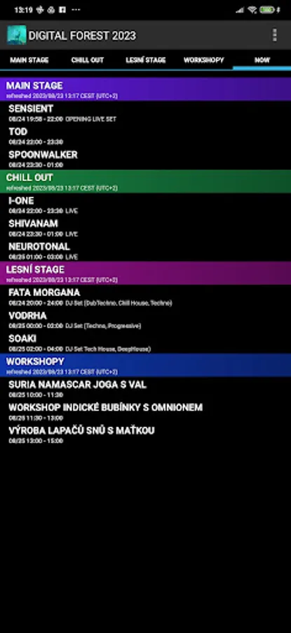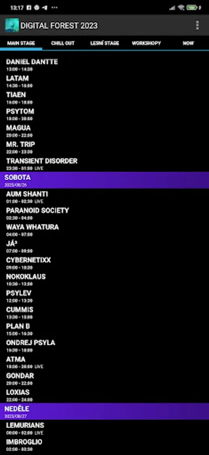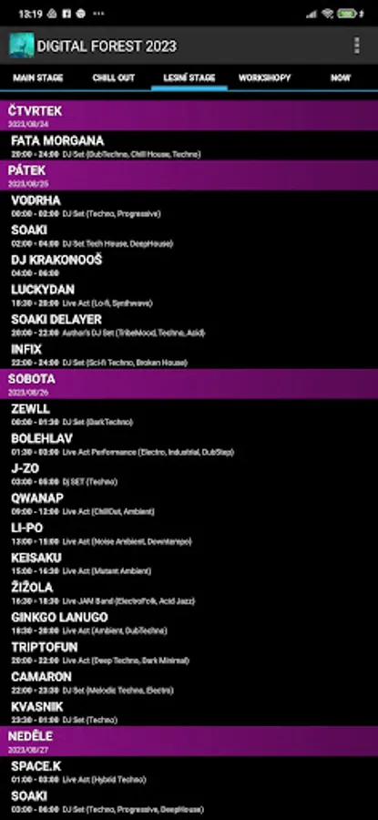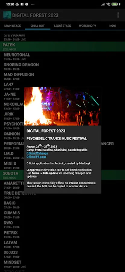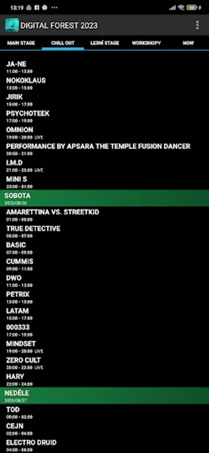 Digital Forest 2023 festival line-up timetable application.