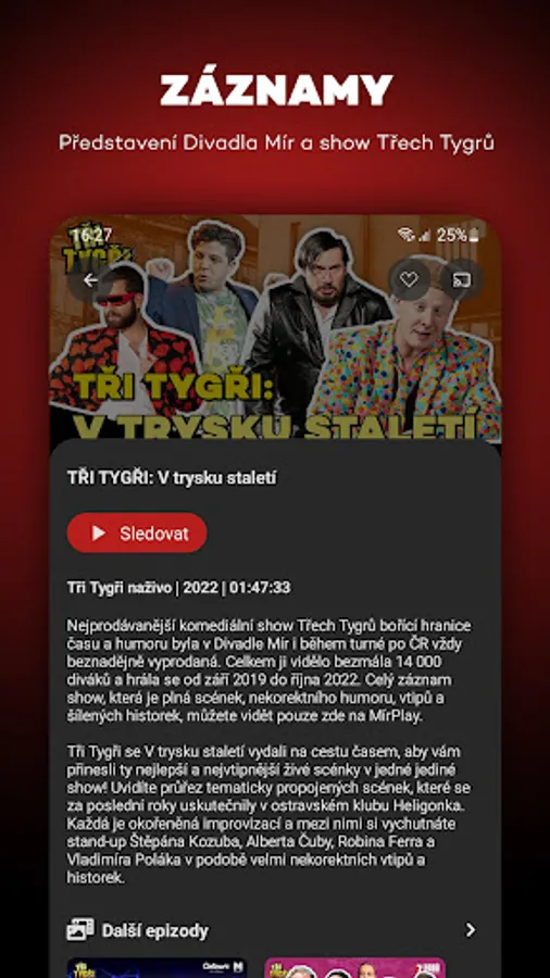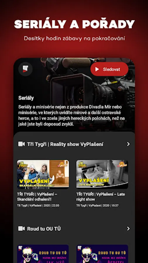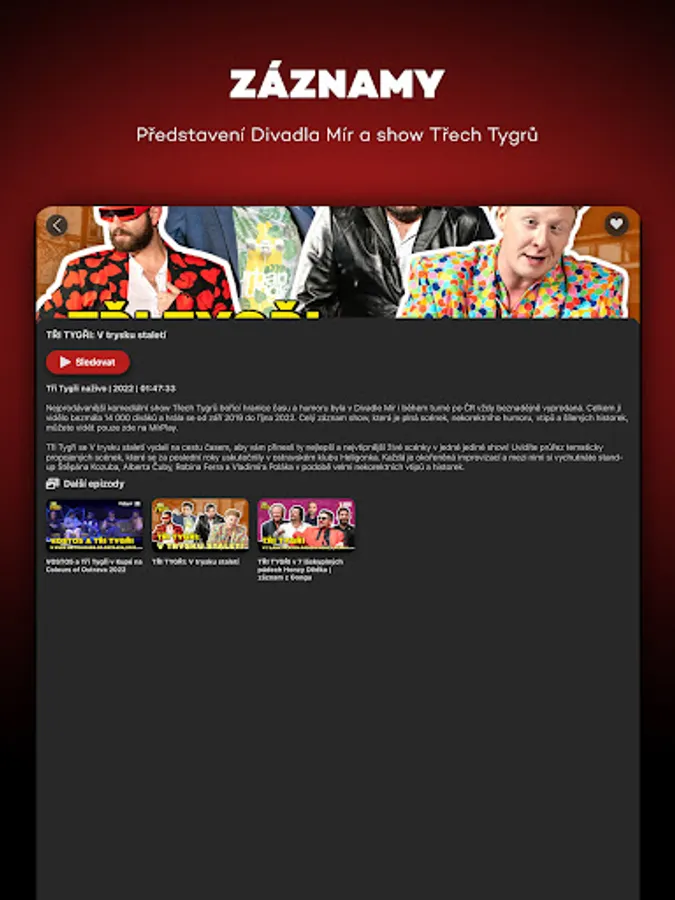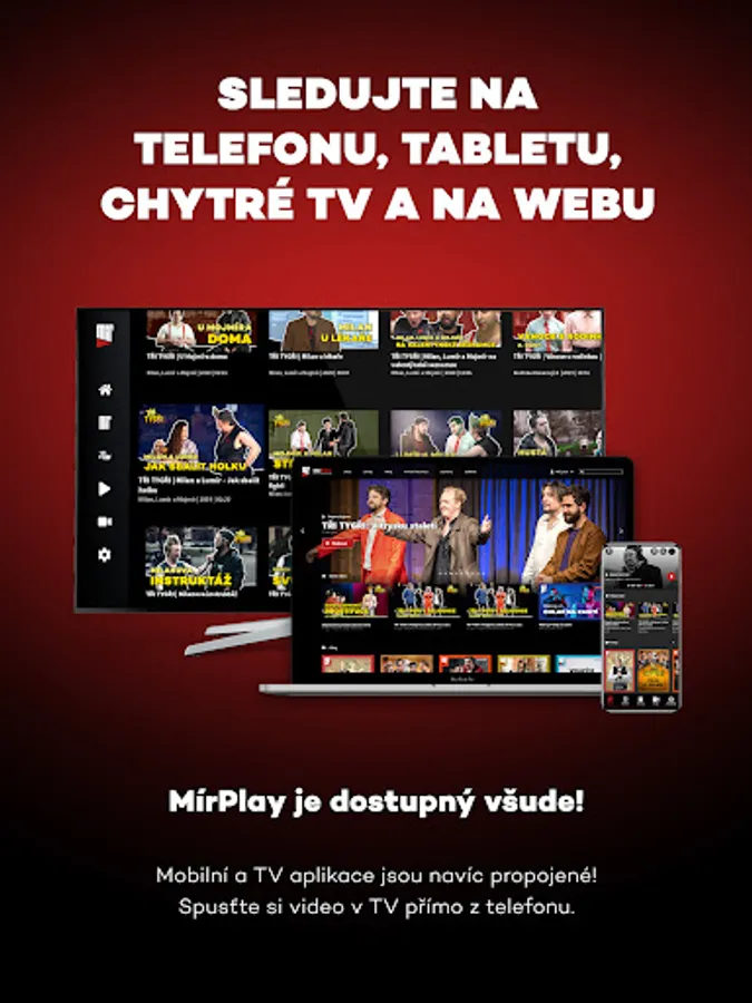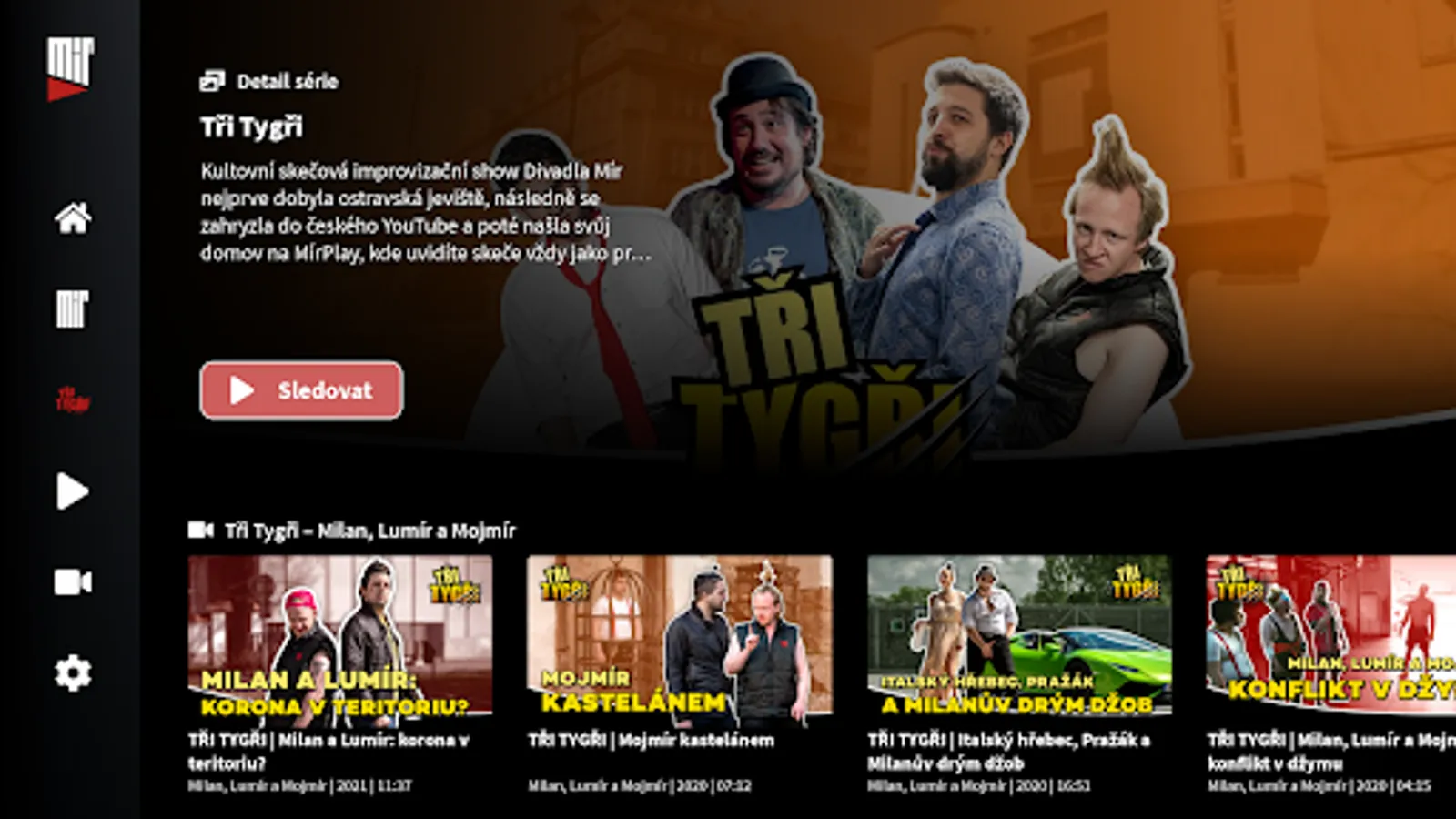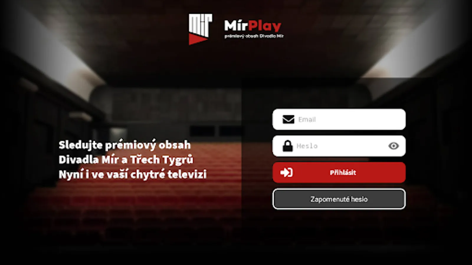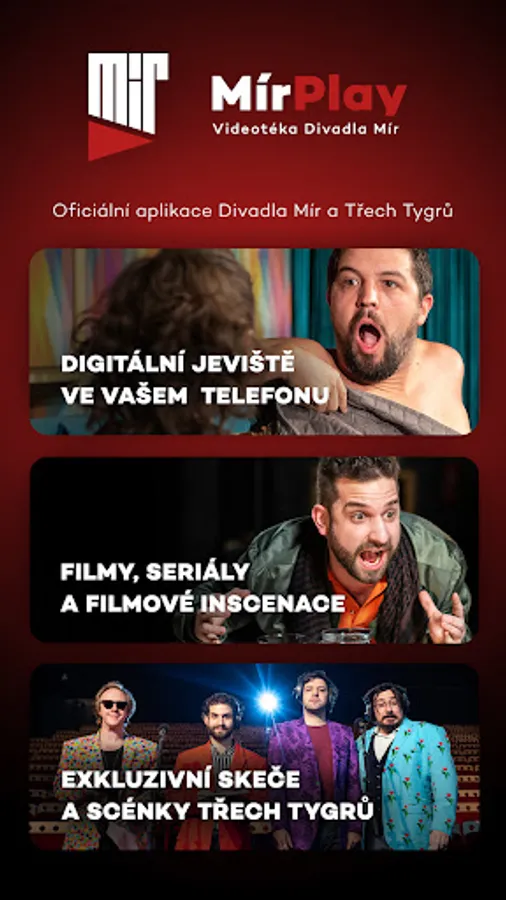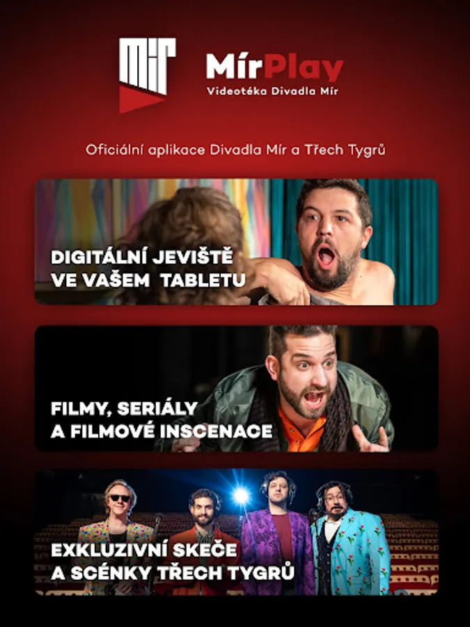 The video library of the Mír a Třech Tygrů Theater is now also available on your smart devices! In the official MírPlay application you will find dozens of hours of entertainment from Mír productions and with your favorite actors such as Štěpán Kozub, Albert Čuba, Robin Ferro, Vladimír Polák and others.