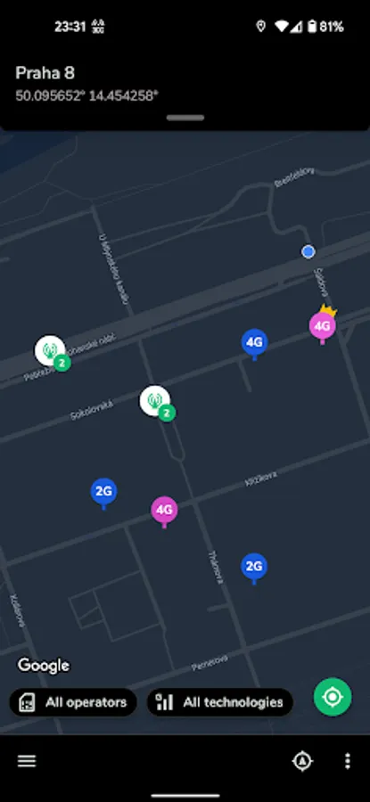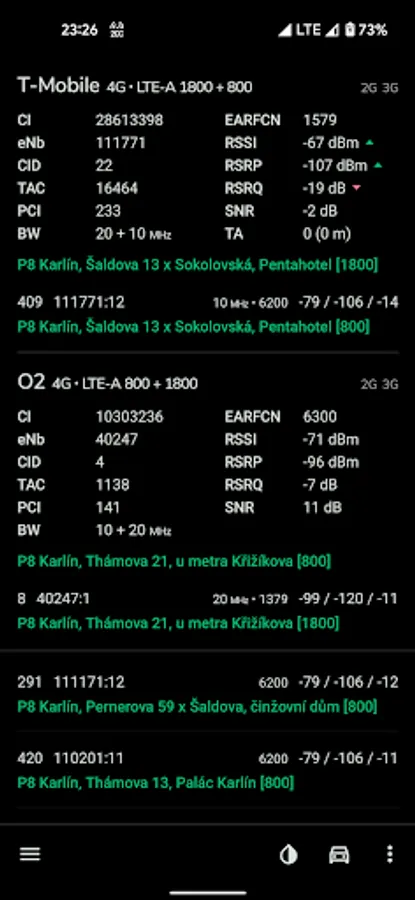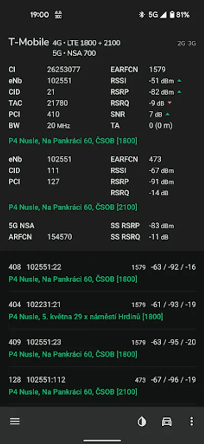 Supported networks are GSM, CDMA, WCDMA, TD-SCDMA, 4G LTE, 5G NSA and 5G SA. When it comes to LTE, NetMonster also detects aggregated carriers (so-called LTE-Advanced). For areas where 5G NSA is available you can see if NSA is in use or just deployed, carrier aggregation in 4G+5G NSA is also available.