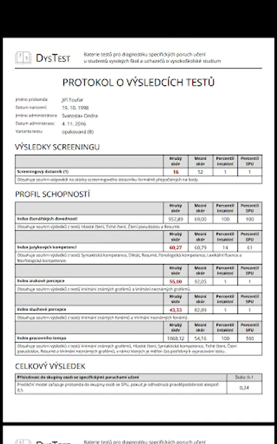The result is a comprehensive set of diagnostic methods that affect the issue of dyslexia in the areas of reading skills, language skills, visual and auditory perception and memory. The battery incorporates screening questionnaire built on the principle of self-rating scale, which can be used in considering the indication of diagnostics and record input anamnesis investigation is possible to use ready anamnestic questionnaire.