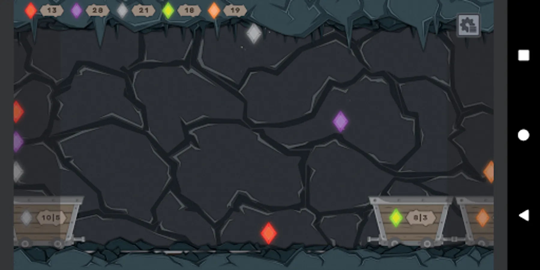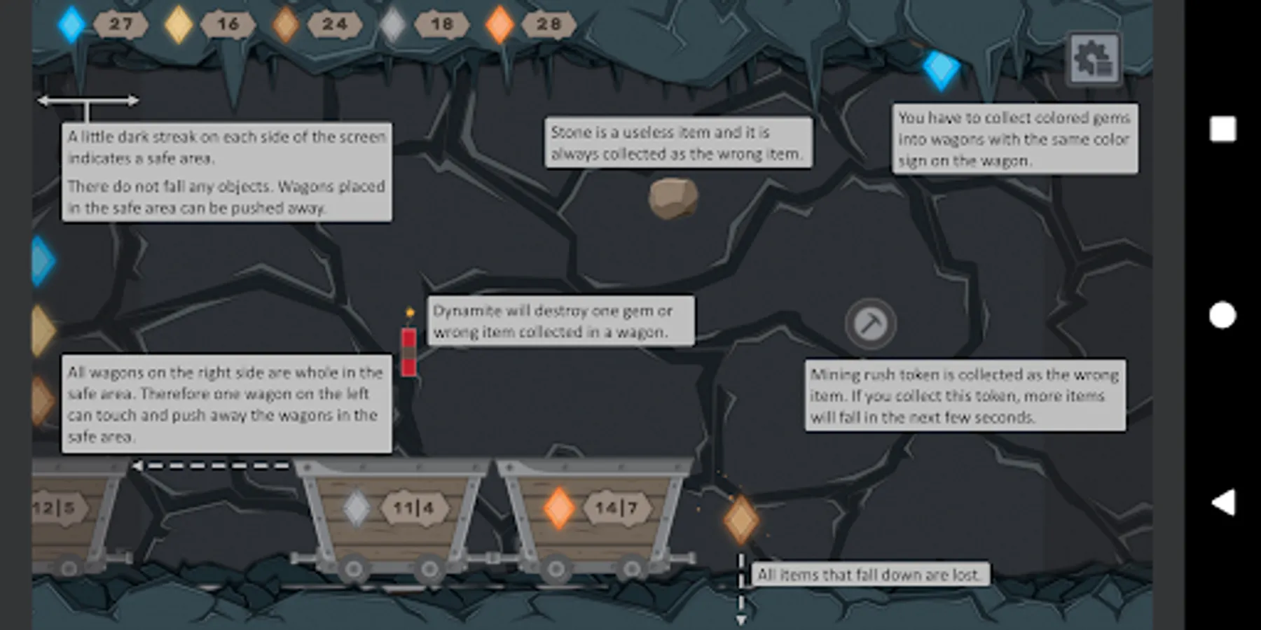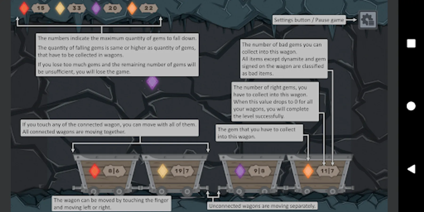 Two numbers on each wagon indicate: (1) how many right gems you have to collect | (2) how many bad gems you can collect