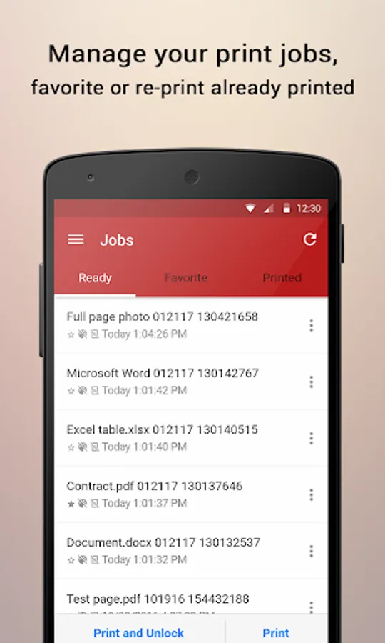 • Manage your print jobs, favorite frequent jobs, or re-print already printed jobs