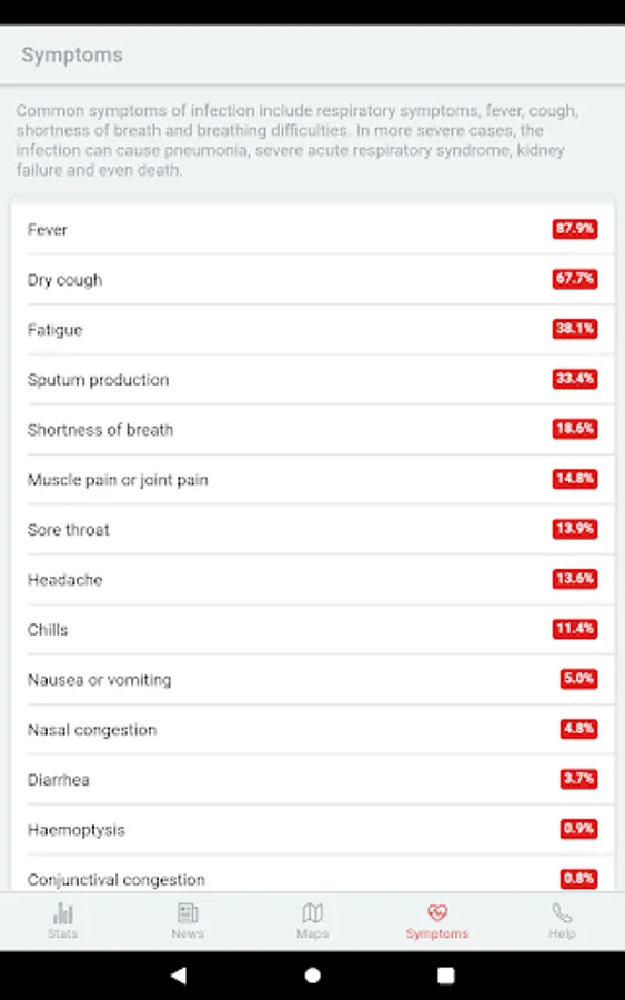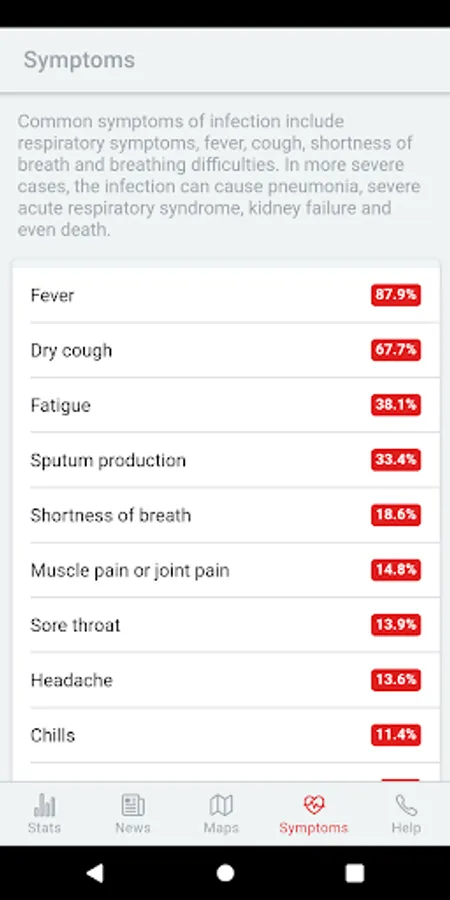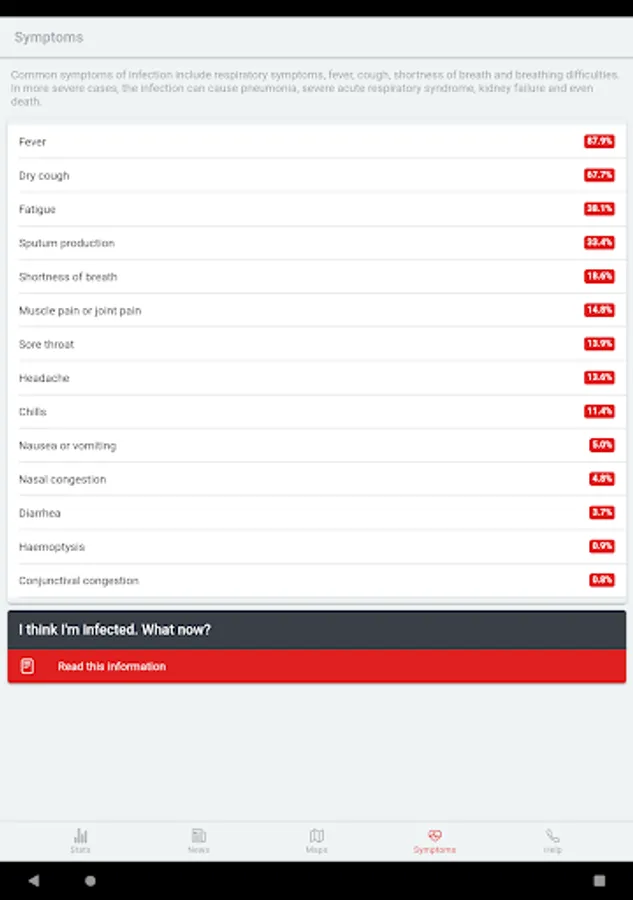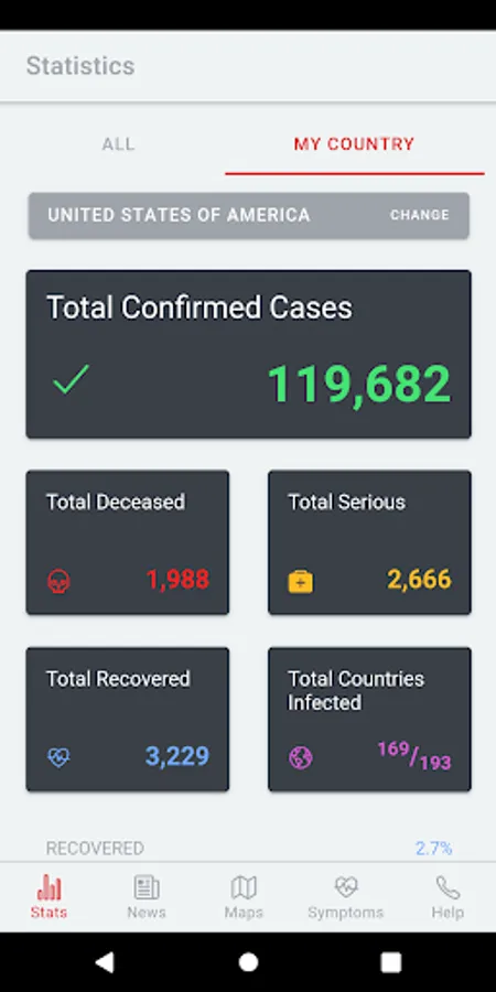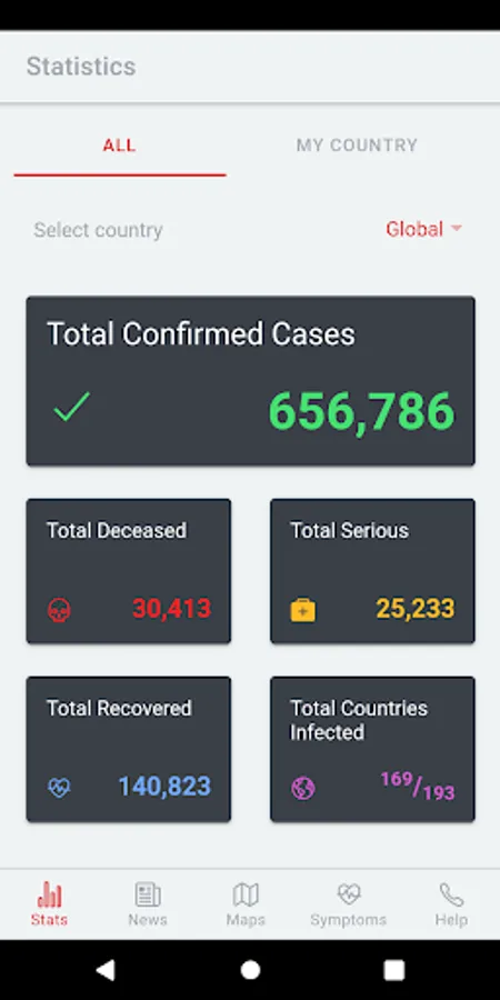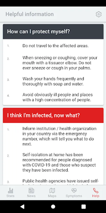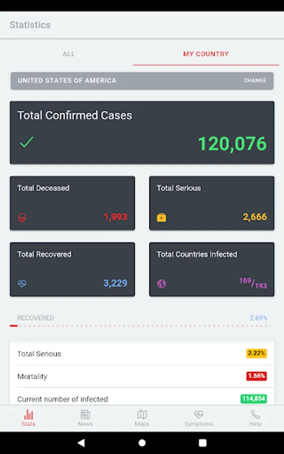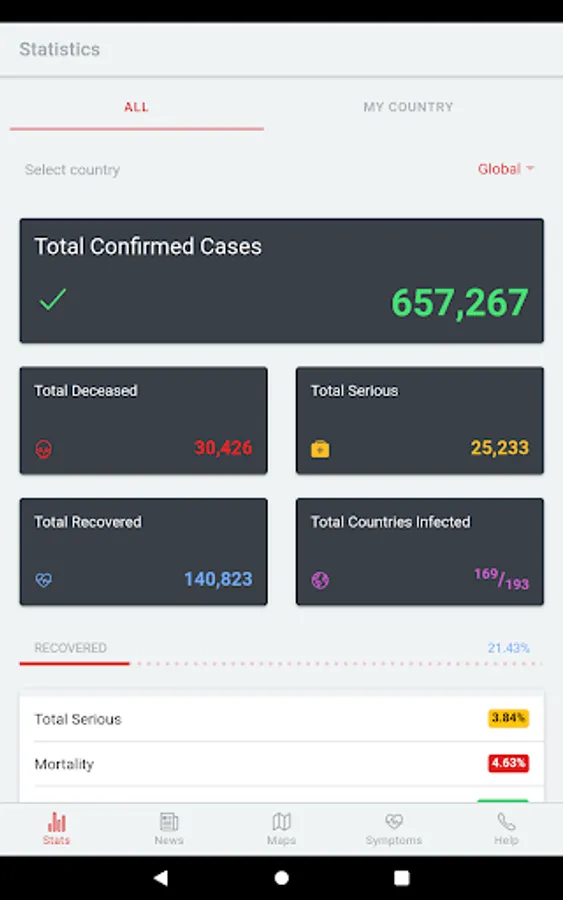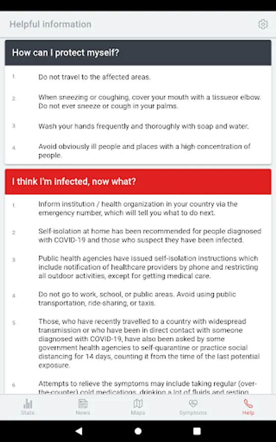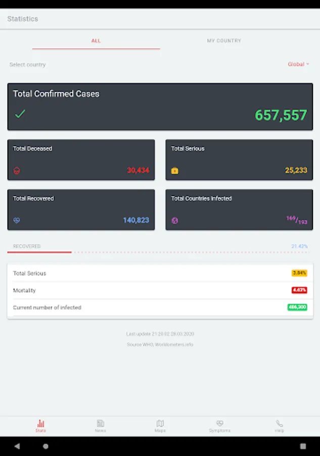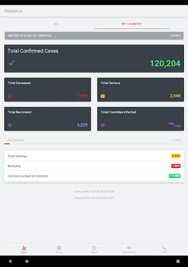 The app contains constant up-to-date information about the infection in numbers, both worldwide and within the selected country. These basic numerical information is supplemented with the latest information and news.