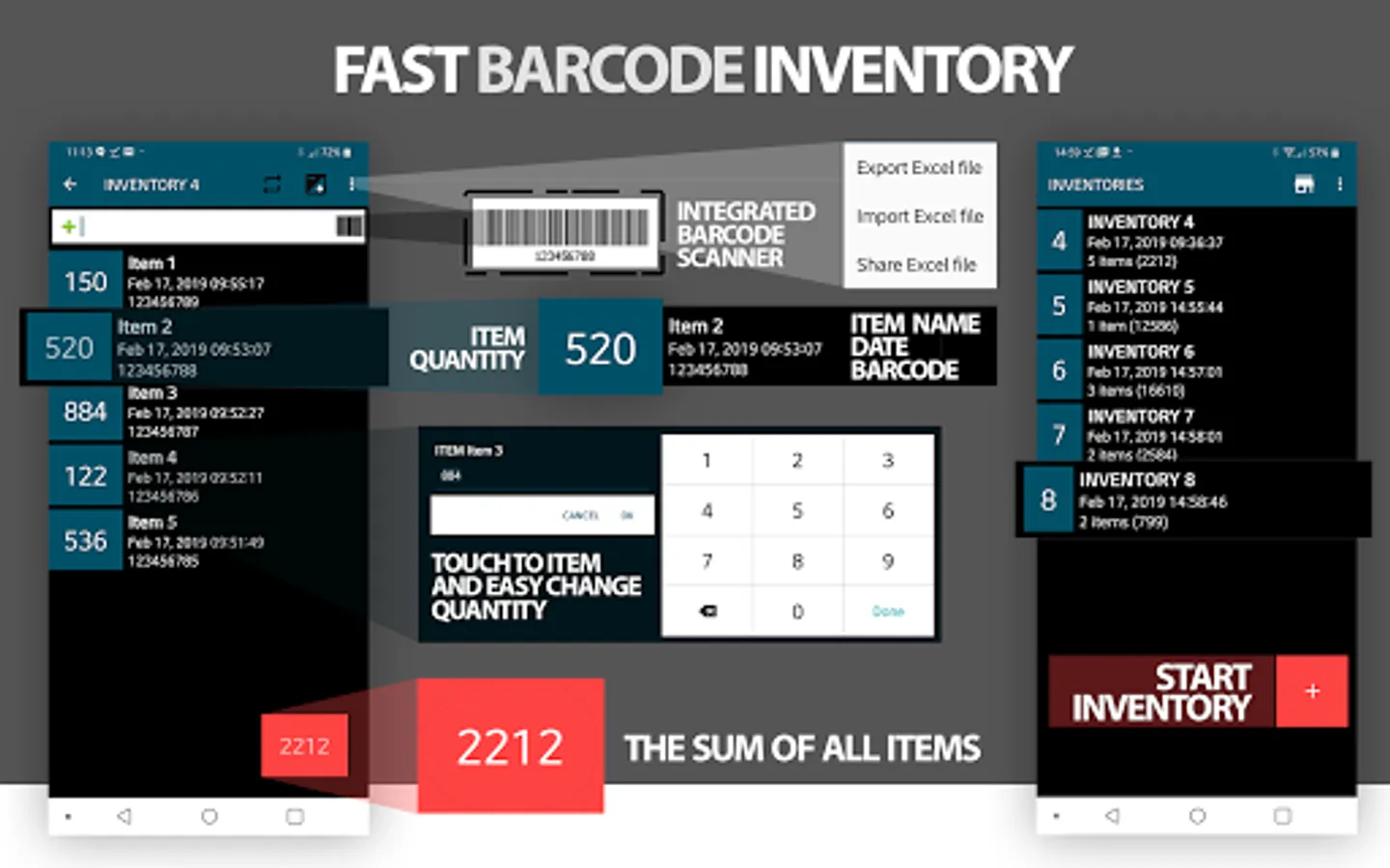 Inventory for business make fast inventory list. Compatible with all barcode scanners "Bluetooth barcode scanner, wireless barcode reader" and other. Can be used as Data collector.