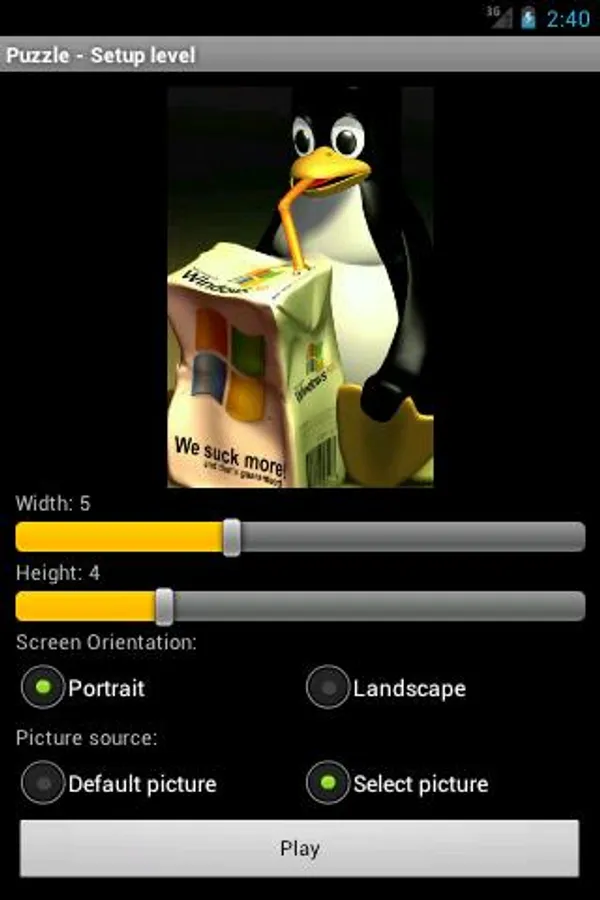 Simple logical puzzle game. You have to complete image by moving cells. You can choose your own image or use number field. You can set difficulty by setup count of cell in row and column. After complete level shows you total time which you needed. Game saves best times so you can play again and again for better result. If game is to long you can save it and finish it later.