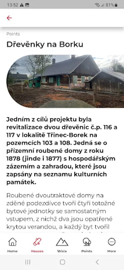 The post-and-plank houses at Borek, revitalization of two wooden houses No. 116 and 117 in the locality of Třinec-Borek serving as an open-air museum, whose four residential units present the development and changes in the housing culture and lifestyle of a worker of the Třinec ironworks during the 20th century. Typologically, it is an exposition of a way of life that reflects a theme from the regional environment and represents the recent past almost up to the present.