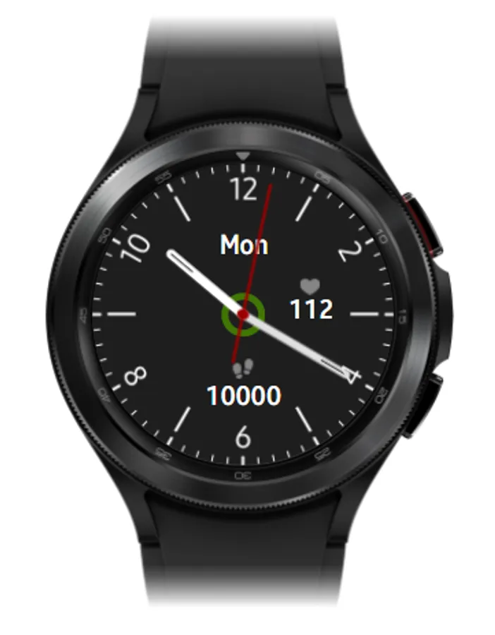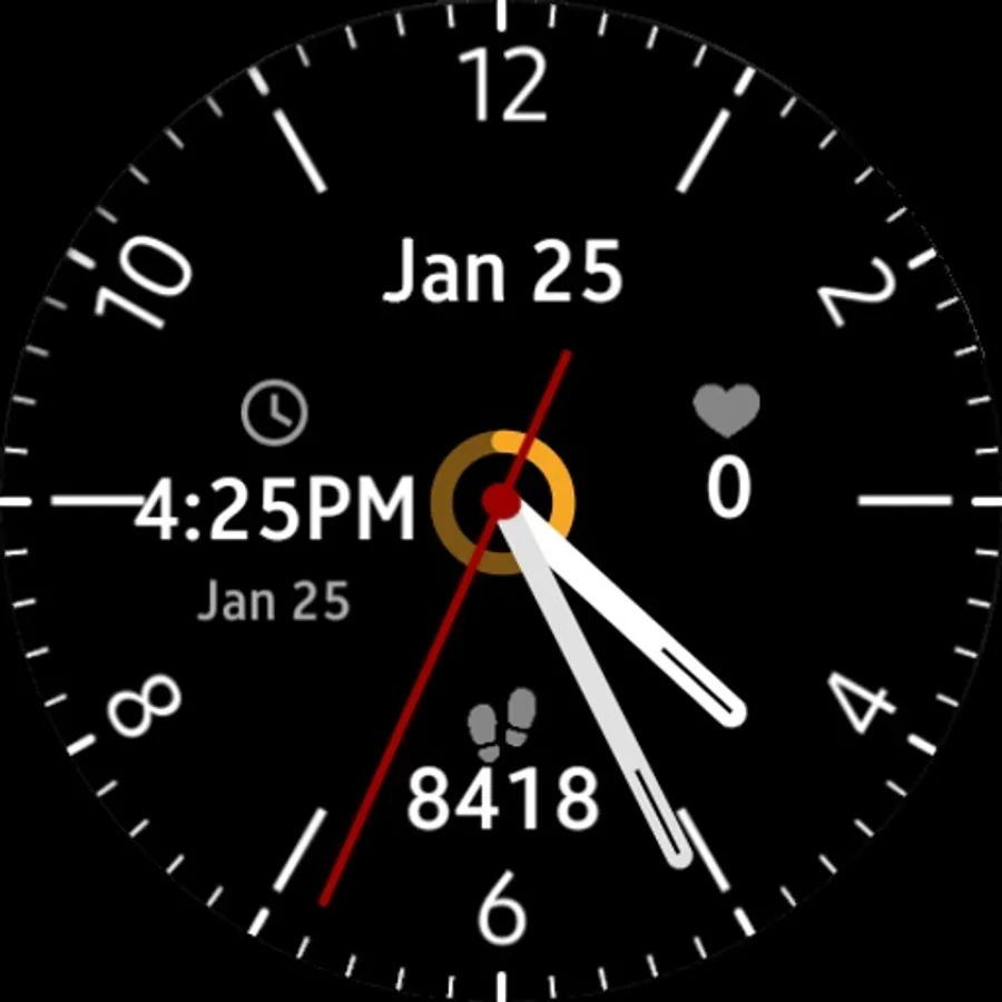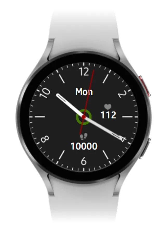 A simple analog dial with a step and heart rate indicator, customizable field and a colored battery indicator in the middle. With its minimalist look, it is suitable for everyone who likes things clear.