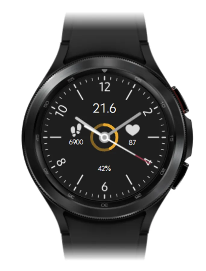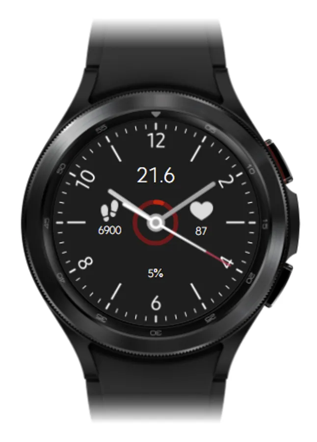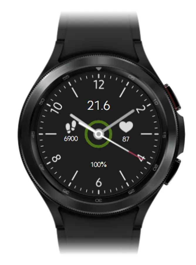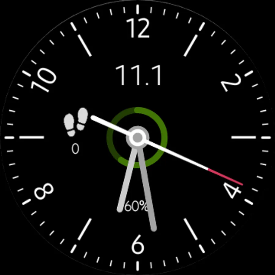 A simple analog dial with a step and heart rate indicator and a colored battery indicator in the middle. With its minimalist look, it is suitable for everyone who likes things clear.