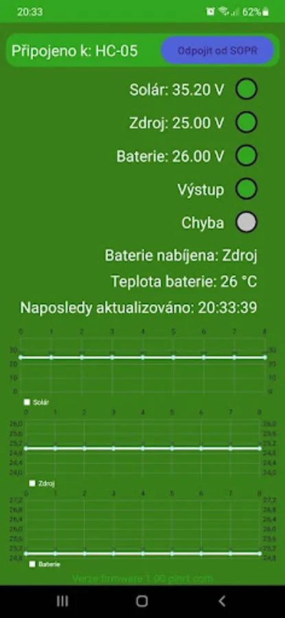 This application is used to enumerate and display values from the SOPR device (solar switch). The app can display voltage values (photovoltaic, source, battery, output) and history graphs (records after 30 minutes).