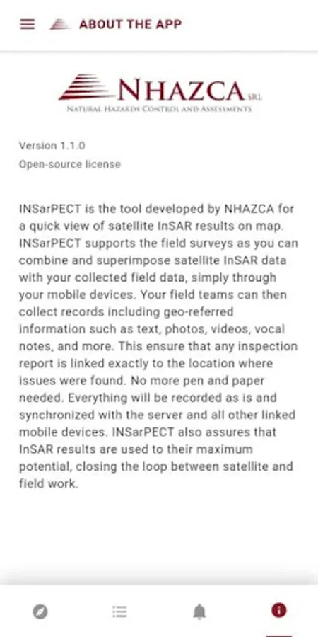 INSarPECT is the tool developed by NHAZCA for a quick view of satellite InSAR results on map. INSarPECT supports the field surveys as you can combine and superimpose satellite InSAR data with your collected field data, simply through your mobile devices. Your field teams can then collect records including geo-referred information such as text, photos, videos, vocal notes, and more. This ensure that any inspection report is linked exactly to the location where issues were found. No more pen and paper needed. Everything will be recorded as is and synchronized with the server and all other linked mobile devices. INSarPECT also assures that InSAR results are used to their maximum potential, closing the loop between satellite and field work.