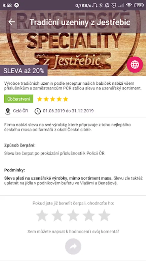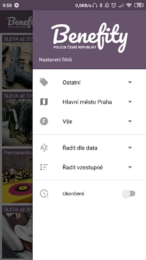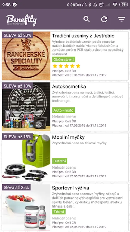 The application is intended exclusively for police officers and civilian employees of the Czech Police who have access to the Czech Police Intranet. It is possible to register at the intranet address benefity.pcr.cz and generate an access code. Subsequently, the application displays an overview of employee bonuses, benefits and discounts for specific merchants who provide benefits to police officers or IRS members.