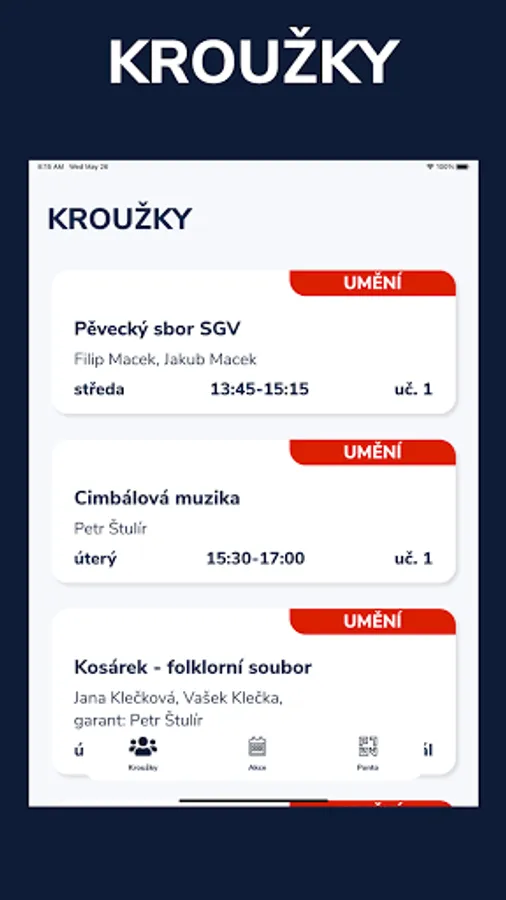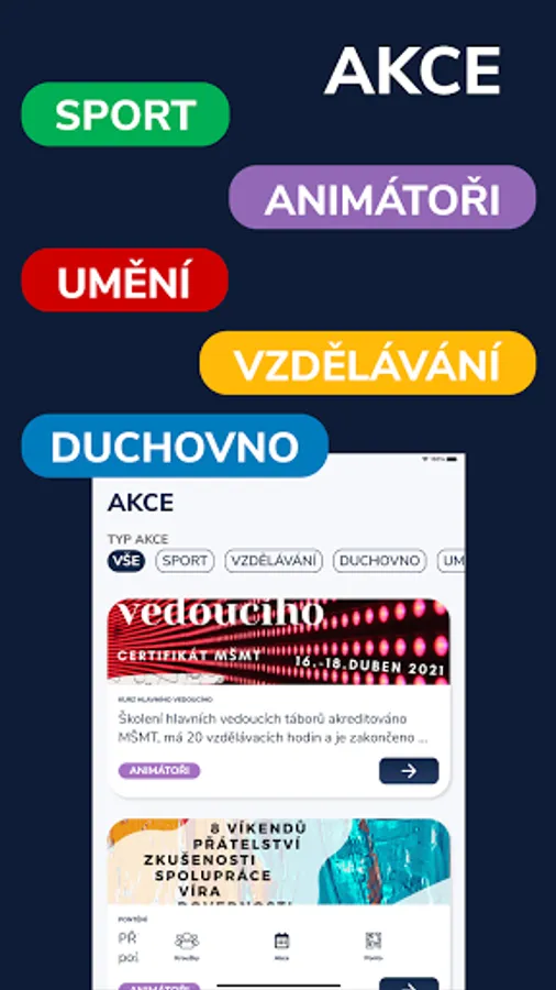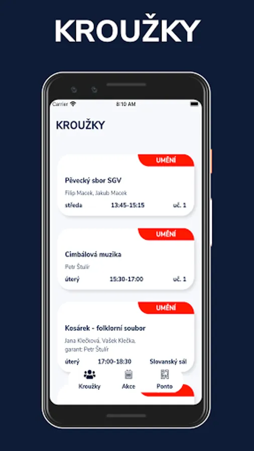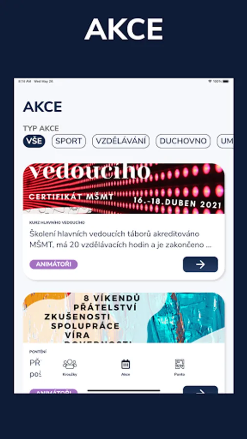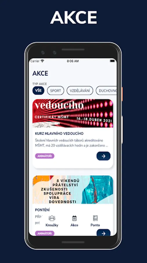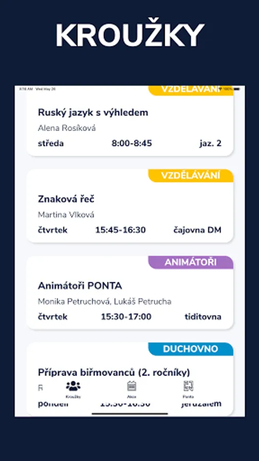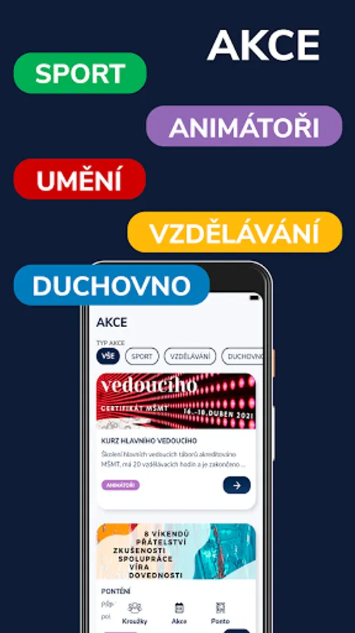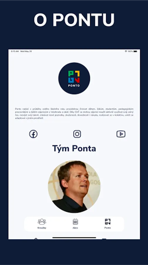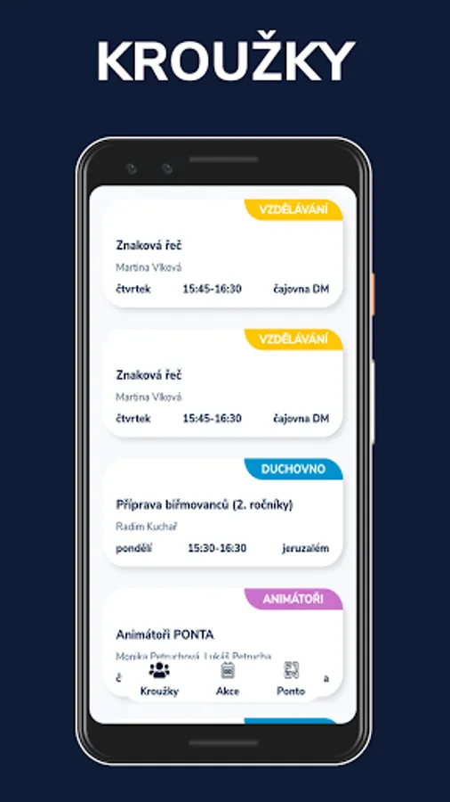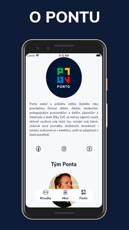The aim of this application is to provide information about events and clubs organized by the Ponto Leisure Center under the auspices of Stojan's grammar school in Velehrad.