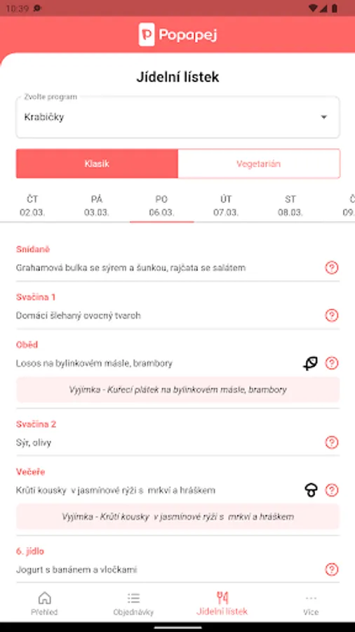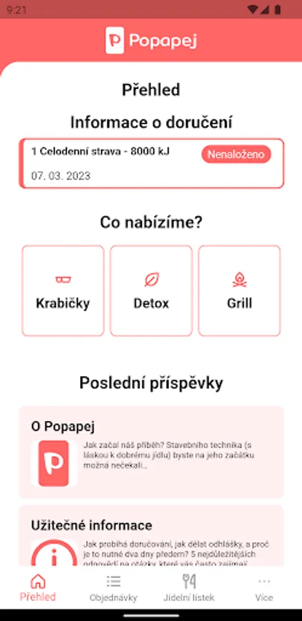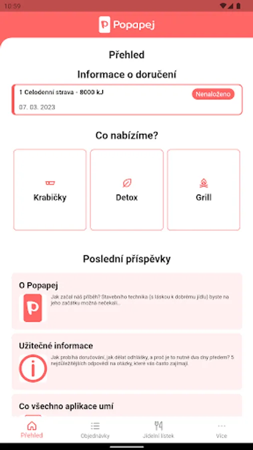 Po přihlášení do aplikace vás přivítá krátký průvodce, který vám pomůže nastavit všechny užitečné notifikace týkající se každodenního doručování objednávek, stavu faktur i novinek v aplikaci nebo nabídce Popapej. Povolit si také můžete přihlašování pomocí biometrických údajů. Na úvodní stránce vás poté bude čekat ještě několik užitečných informací, včetně odpovědí na nejčastější otázky ohledně doručování krabiček nebo jejich dočasného odhlašování.