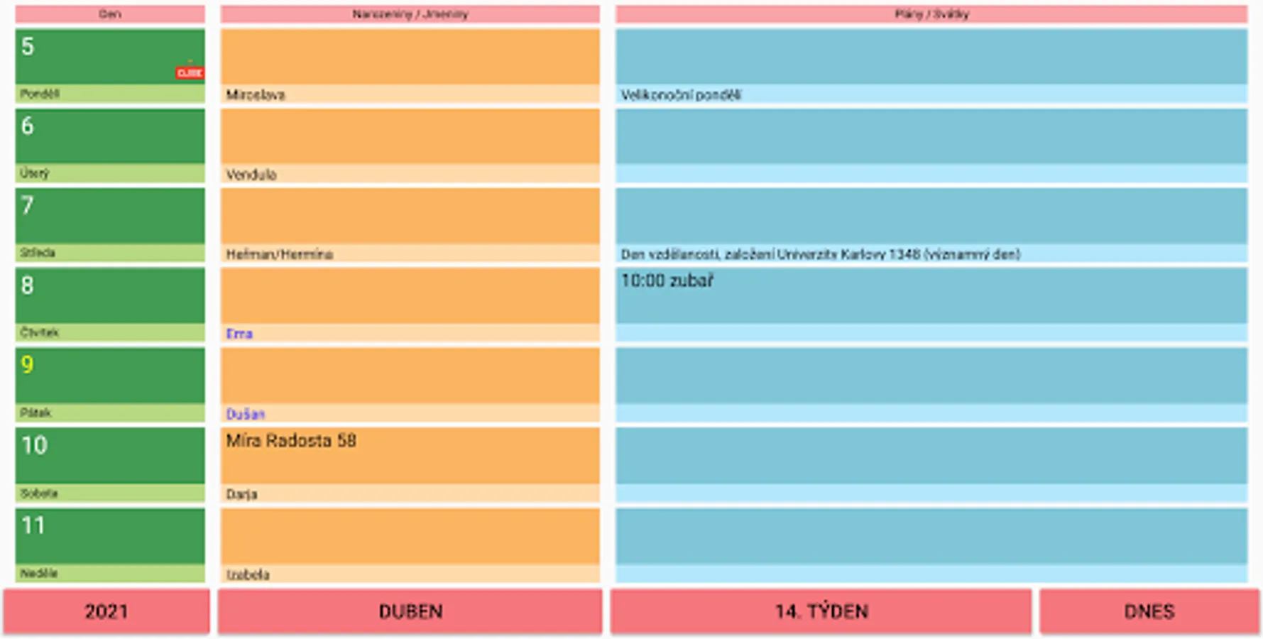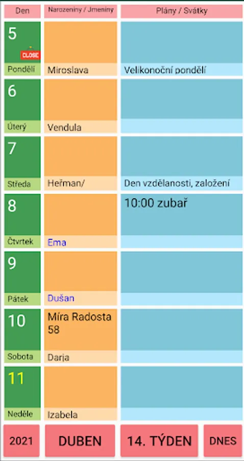 During the current year, it shows the days of the week, names, birthdays and deaths, holidays when shops are closed, important days and registered reminders in the preview of the selected week. Birthdays and notes can be easily searched.