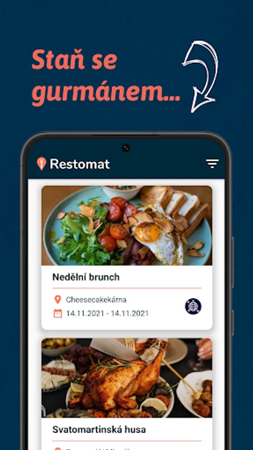 Don't know where to go for lunch, dinner or maybe brunch? Are you tempted to discover new tastes, or do you choose a proven classic? The Restomat application brings you great news from your favorite companies about gourmet events such as venison feasts, burger festival, steak days and many other unique gastronomic events in your locality. Whether you are looking for a clear daily menu or you want to discover new flavors in our application, you will find everything from the slaughterhouse Na Růžku to a tasting afternoon in a leading Asian restaurant.