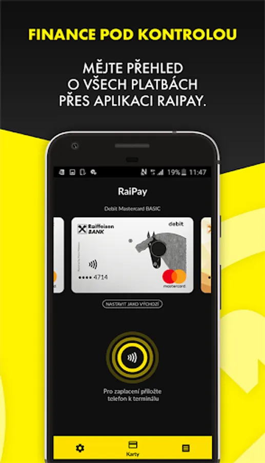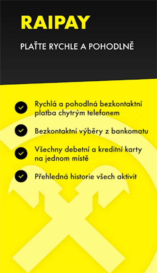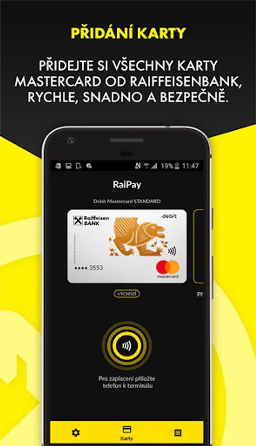 RaiPay is Raiffeisenbank's banking application that allows you to add Mastercard debit and credit cards from Raiffeisenbank, in order to make contactless payments by mobile phone or contactless withdrawals from ATMs. In the application, the client can see additional information about the card and transactions, as well as set the level and form of security or appearance. It is designed for mobile phones with Android version 7 and higher and supporting NFC technology (HCE type). It is necessary to have active Raiffeisenbank mobile banking to add cards.