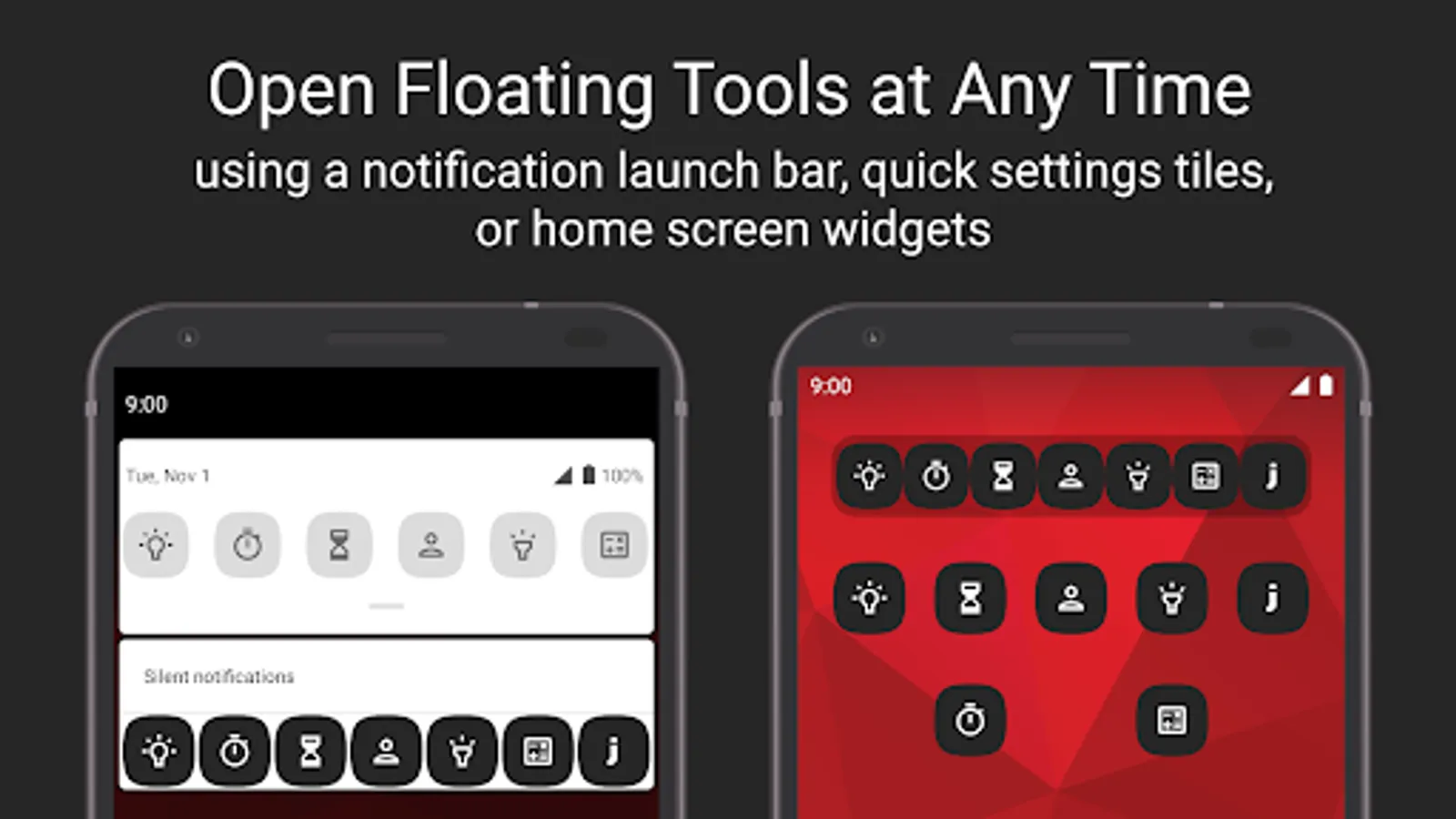 Access Floating Tools anytime using a launch bar in the notification drawer or add a quick settings tile for selected apps to your status bar (Android 7.0 and higher).