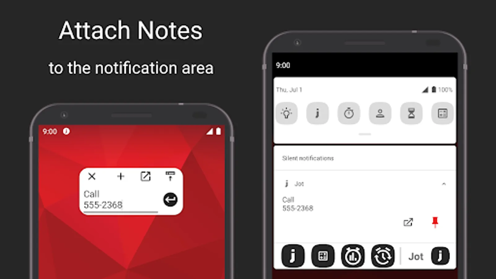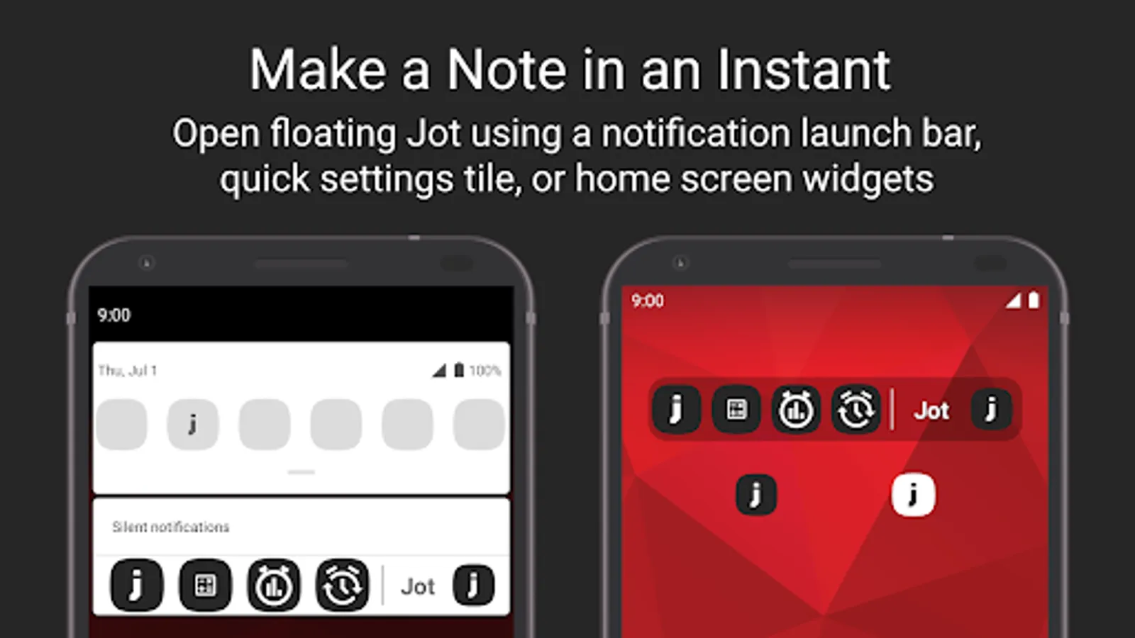 Using floating Jot, you can easily create notes even on top of any other application without interrupting its normal behavior. This allows you to take a quick note or jot something down whenever you want and it will be waiting for you in the Jot notepad app. Floating Jot can be launched either using custom tile in the quick settings area, home screen widget, app shortcut, or from a dedicated launch bar in notifications. The launch bar is capable of launching up to 6 other applications.Notepad