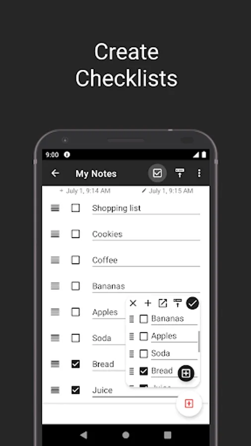 Both floating Jot and fullscreen notepad application come with checklist mode. In the checklist mode, you can create a shopping list, to-do list, or any other list you can think of. You'll be able to reorder list items or mark the task as done with a simple gesture.With Jot, you can take as many notes as you want. No limits. Don’t hesitate and try out Jot right away if you want a fast, reliable, and easy-to-use note taker that can be adjusted according to your needs!