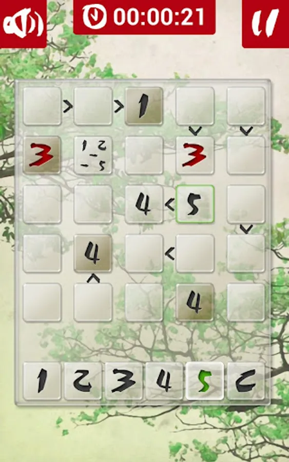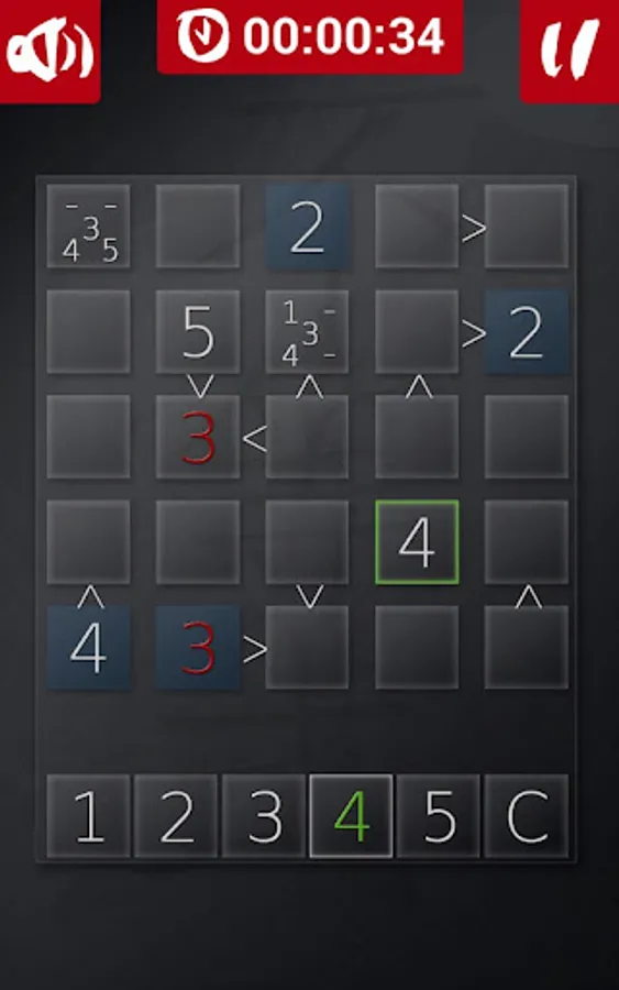 On a 5x5 grid the aim is to put, in each row and column, numbers from one to five, so they do not repeat themselves. Numbers must also respect the relational signs placed between some cells. Some cells may already be filled from the beginning. They are, like the relation signs, part of the puzzle and cannot be overwritten.