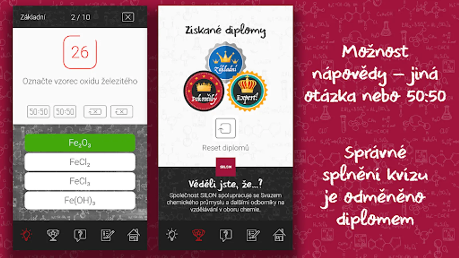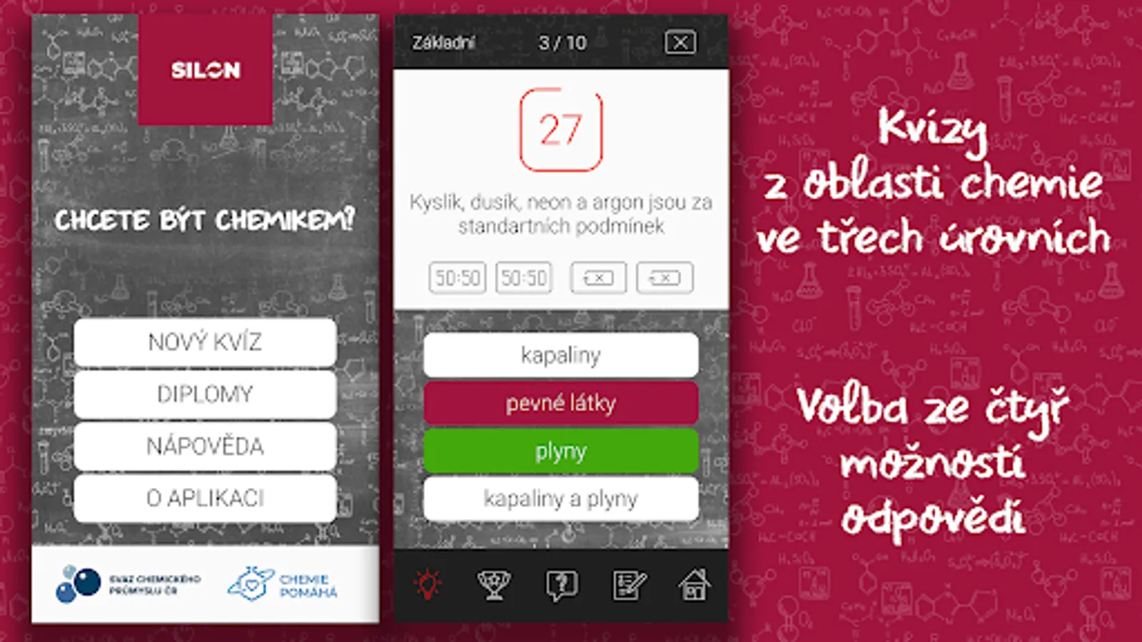 The application was created in cooperation with SILON s.r.o., the Association of the Chemical Industry and the Secondary Industrial School of Chemistry Pardubice and is intended for those interested in the field of chemistry from the general public. It allows you to playfully verify knowledge in the field and teach new knowledge.