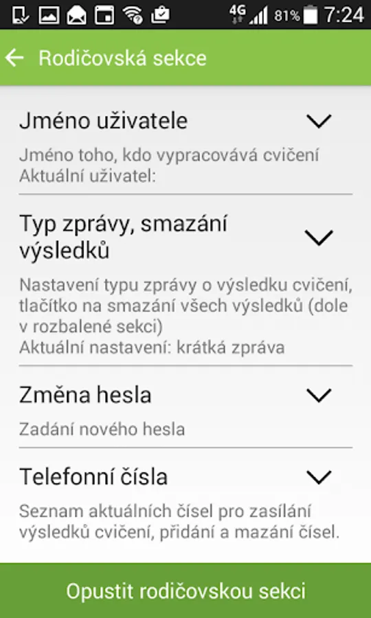4) After leaving the parental section can start practicing after completion - evaluate each exercise goes sms with the result of the exercise active phone number. If the phone is outside the mobile operator's signal, not sent, the result will be sent when processing the next workout, when your phone is within range.
