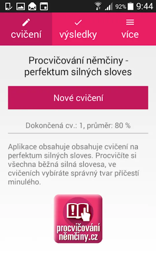 Practice quickly and easily German strong verbs. The application contains all the commonly used German strong verbs and always randomly generated exercises of ten tasks. Selected participle form of the two options after evaluating instantly see how you fared, while wrong answers appear right solution. Tests are similar to those used in schools.