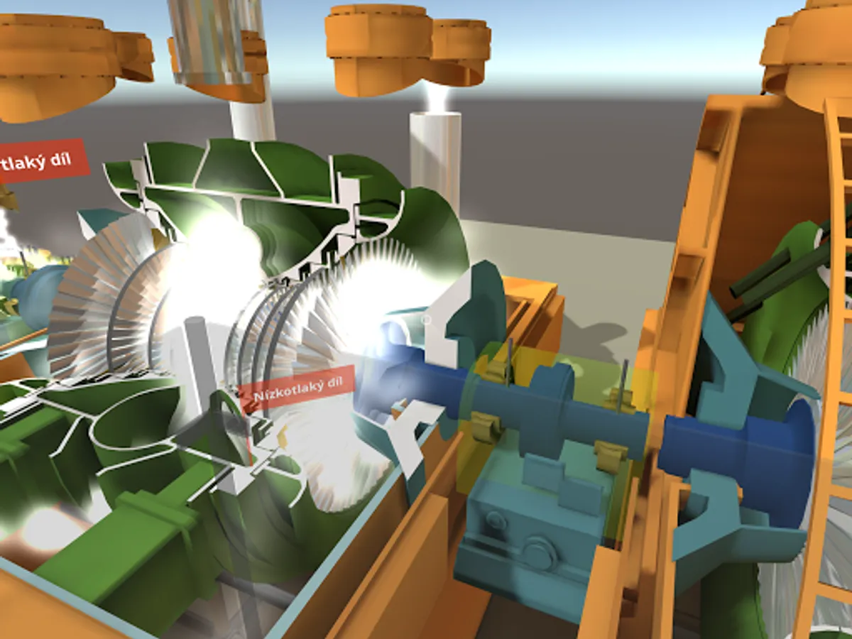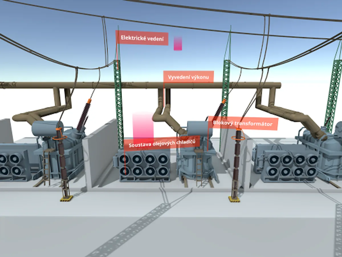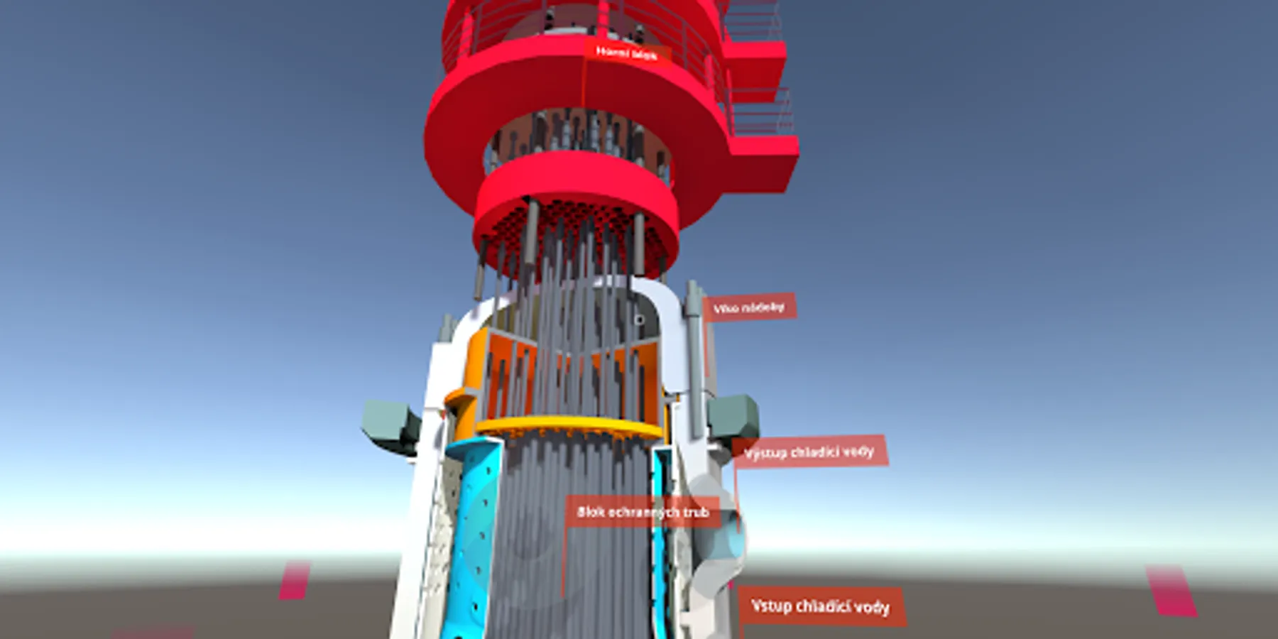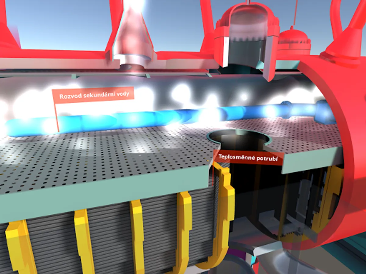 The introduction of the nuclear power plant includes 12 scenes with models of external and internal equipment. The most impressive are the nuclear power plant cylindrical reactor and buildings located in the containment of the main production unit - reactor, steam generator and main circulation pump. Of course, it is possible to see them in one scene only thanks to the possibilities of virtual reality. The secondary circuit is represented by a machine room, a rotating steam turbine and an electric generator. Other scenes show exterior objects - a cooling tower, a used fuel store with Castor containers, or block transformers. Important installations are shown in partial or complete section and the idea of a nuclear power plant is rounded off by the scene of the complete Temelín plant site.