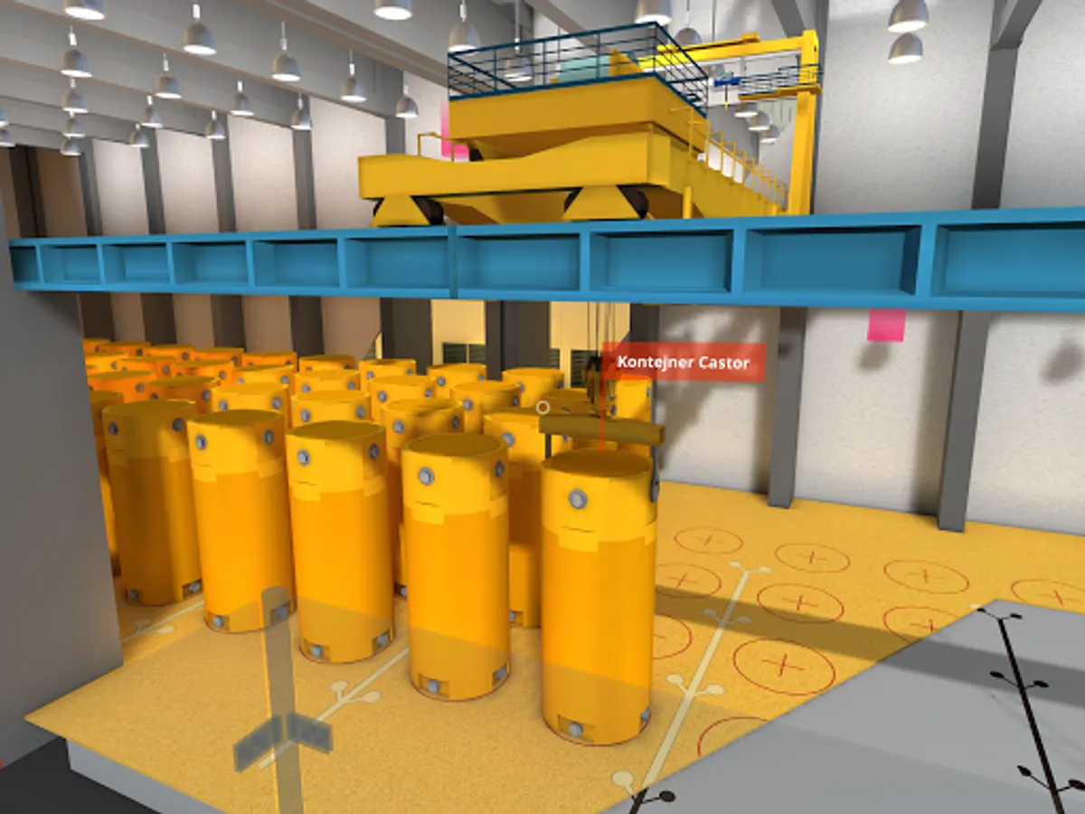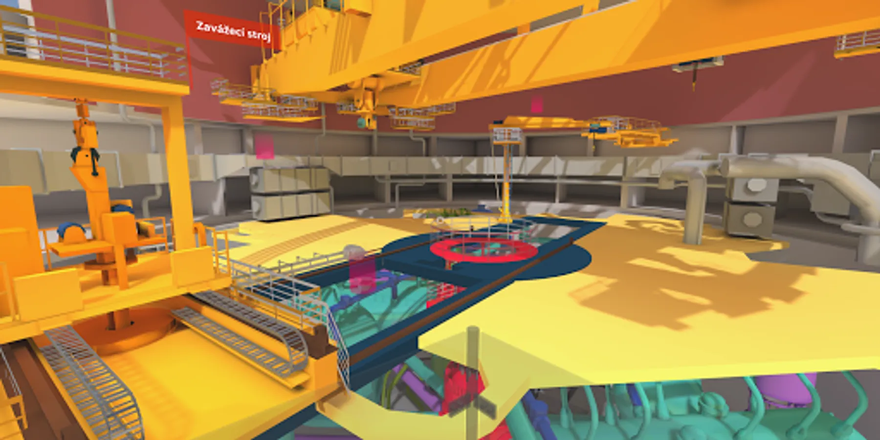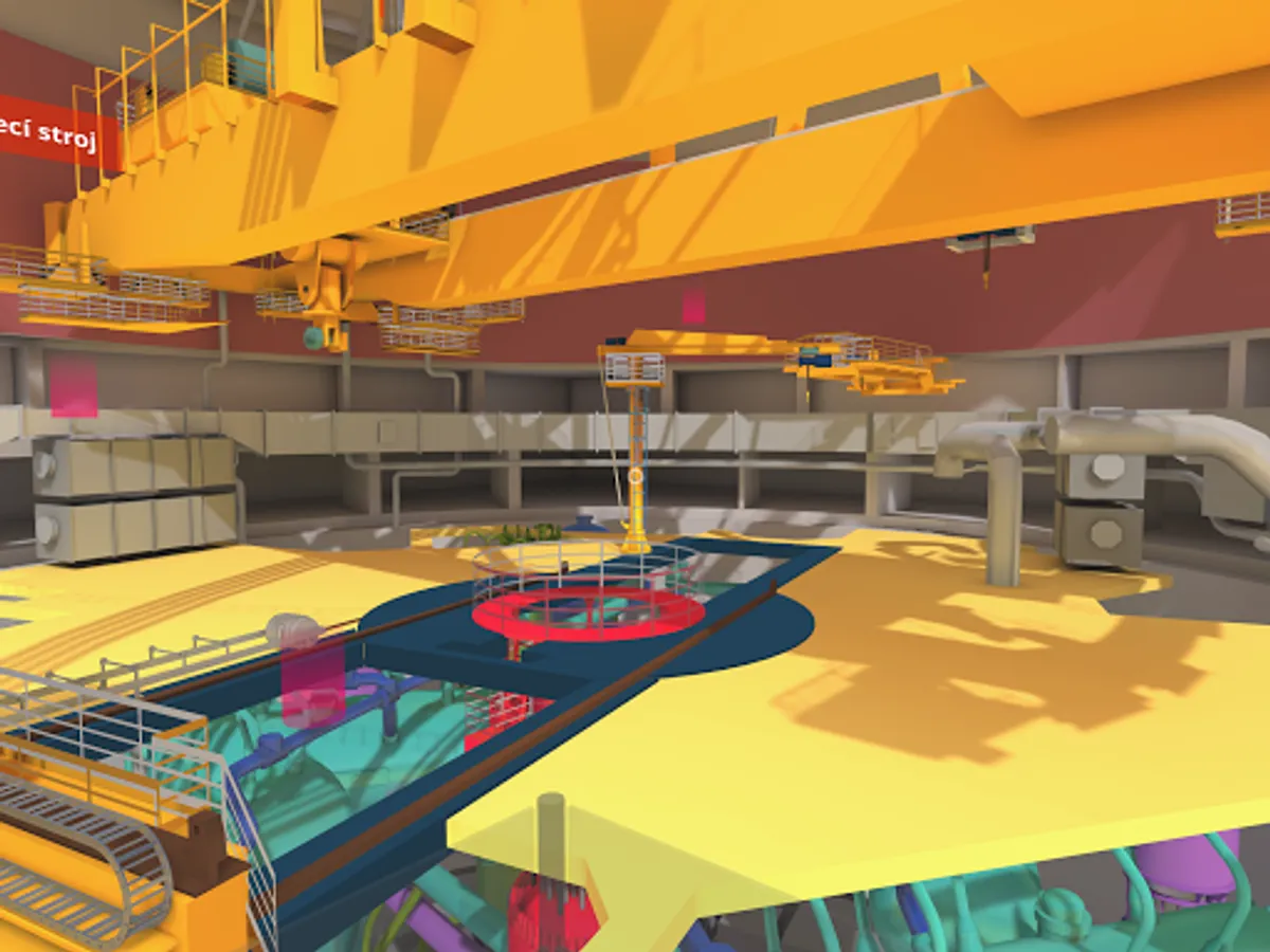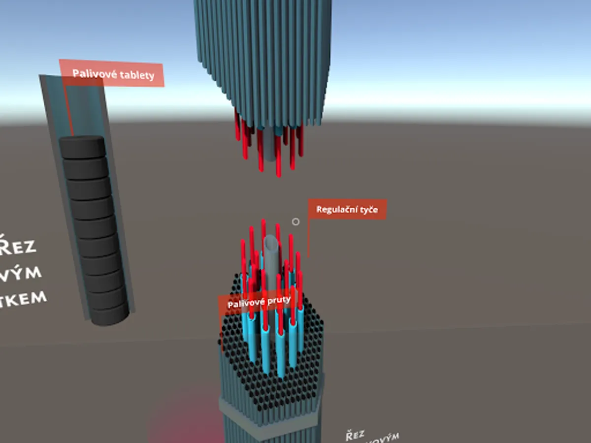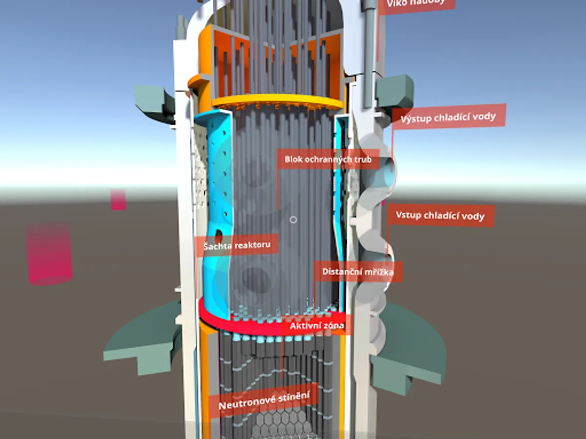 The introduction of the nuclear power plant includes 12 scenes with models of external and internal equipment. The most impressive are the nuclear power plant cylindrical reactor and buildings located in the containment of the main production unit - reactor, steam generator and main circulation pump. Of course, it is possible to see them in one scene only thanks to the possibilities of virtual reality. The secondary circuit is represented by a machine room, a rotating steam turbine and an electric generator. Other scenes show exterior objects - a cooling tower, a used fuel store with Castor containers, or block transformers. Important installations are shown in partial or complete section and the idea of a nuclear power plant is rounded off by the scene of the complete Temelín plant site.