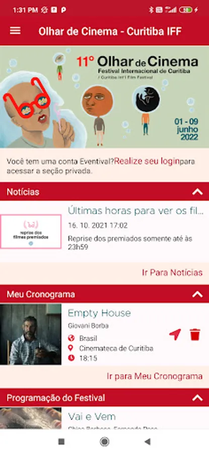 Aplicativo oficial do Olhar de Cinema - Festival Internacional de Curitiba. Nele é possível ter acesso a toda a programação do evento, assim como criar uma agenda pessoal dia a dia do festival.