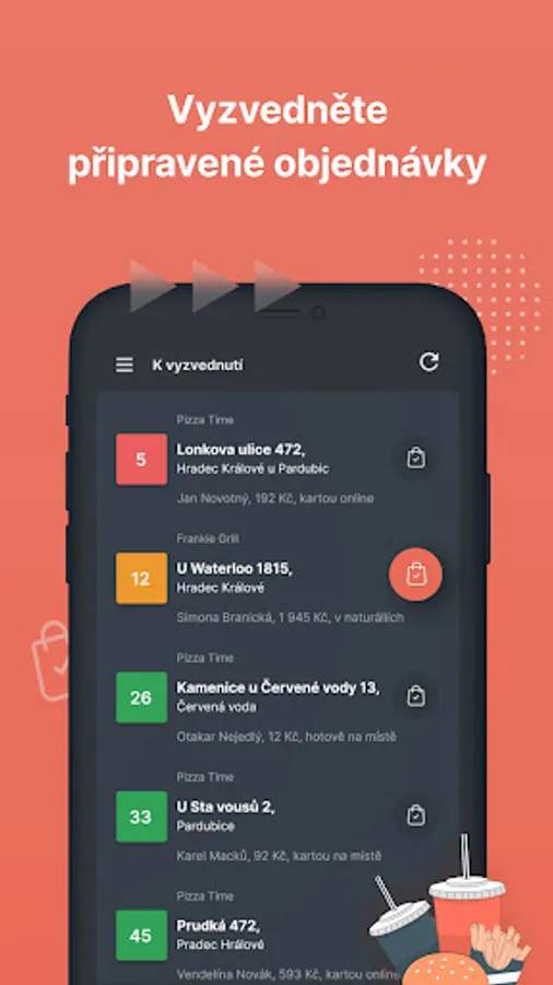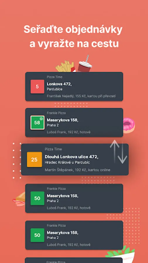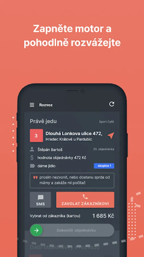 The driver application is primarily for drivers and restaurants that use the speedlo system. In the clear application, keep track of the upcoming orders that you will pick up. Once your order is ready for pickup, it will appear in the app and you're good to go. The application will allow you to navigate directly to the customer via external maps. You can call the customer or inform him about a possible delay using an SMS message. The customer pays on the spot, you give him the order and you can go on your way.