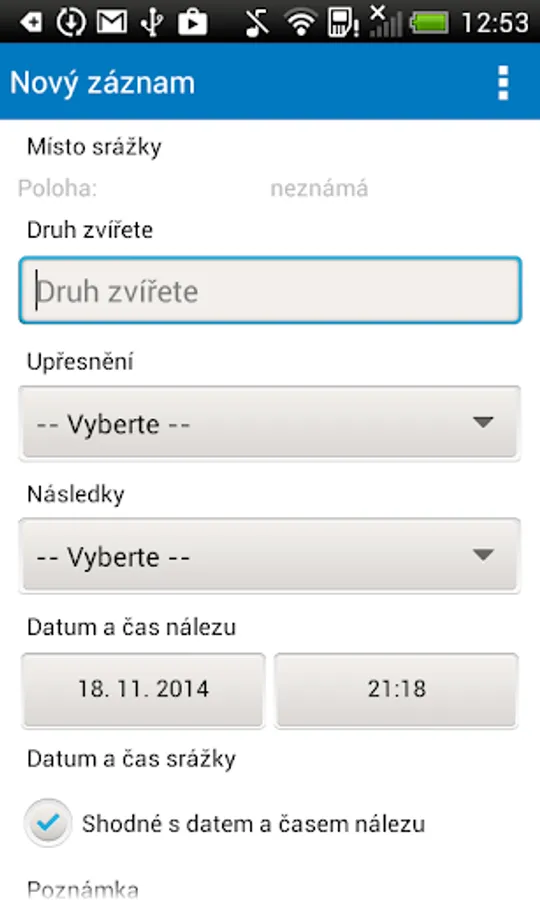 The application was created to record the death of animals due to a collision with a means of transport. It serves individual hunting associations, traffic police, nature conservationists, road administrators, but also the general public. Filling the database will help the research - we try to better understand the circumstances under which these collisions occur. Anyone can enter data after registration. To view and edit, visit the website http://www.srazenazver.cz.