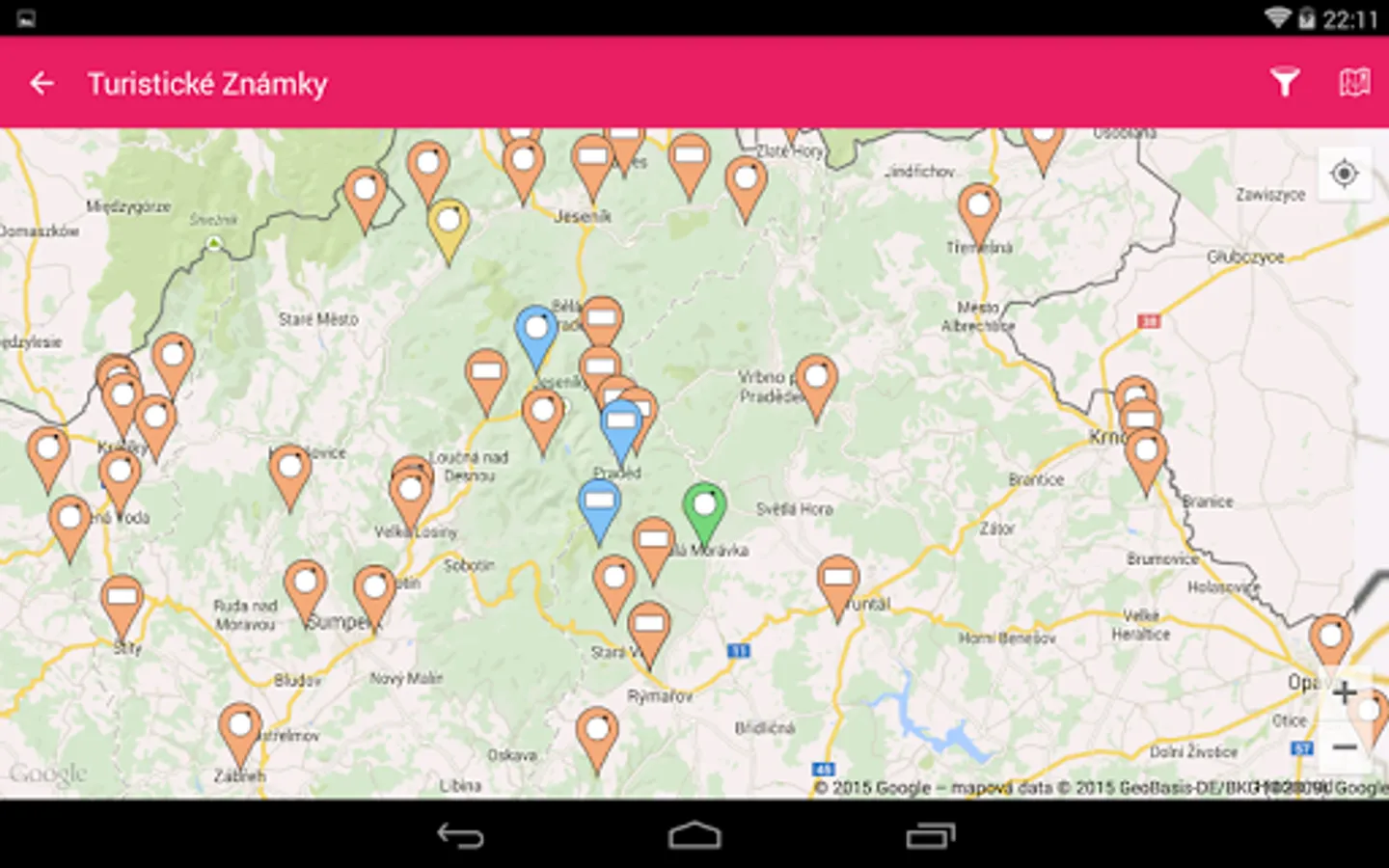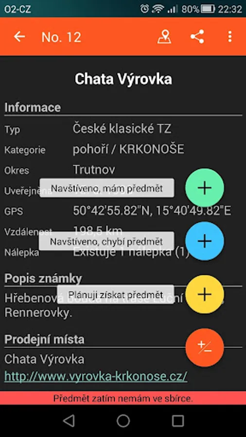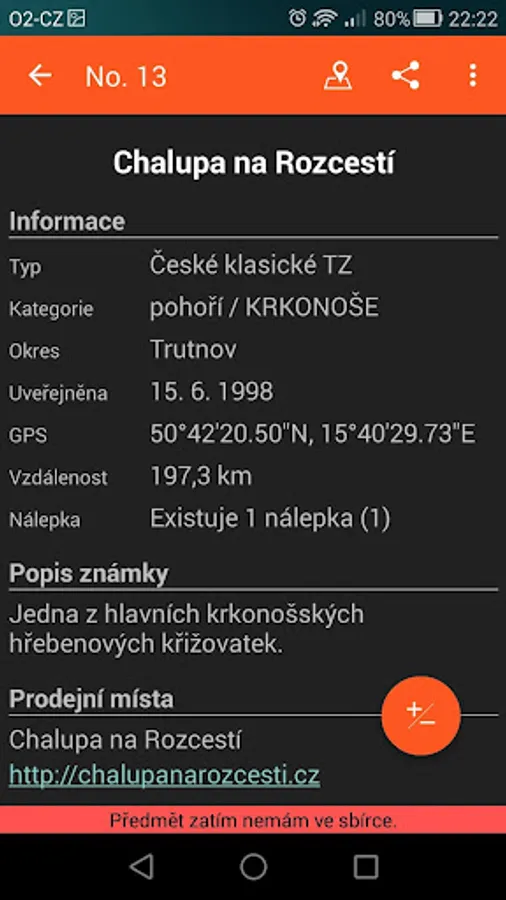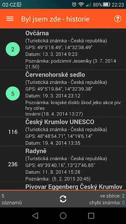 - gps souřadnice známky lze zobrazit v externí aplikaci (podporované jsou: Mapy.cz, Google Maps, Sygic navigace, MapFactor navigace, Locus a Google Earth)