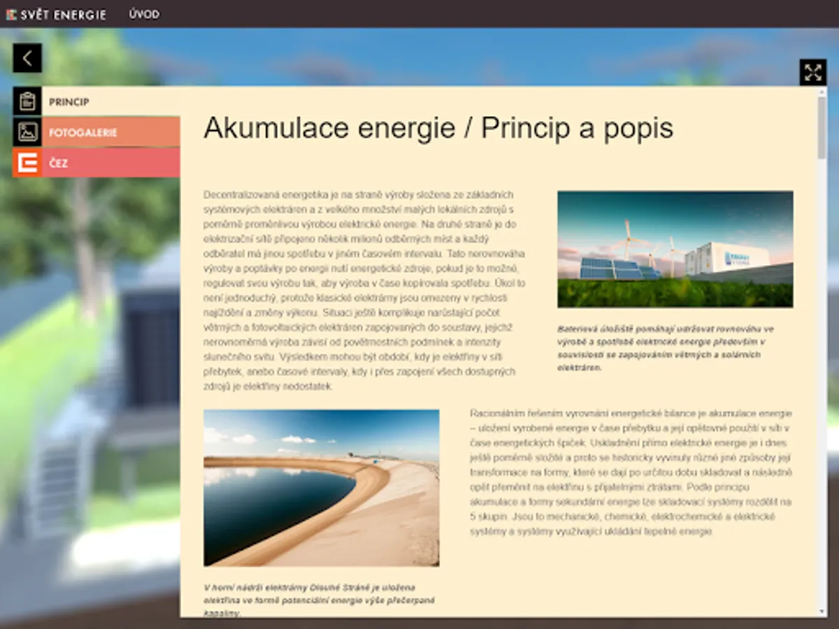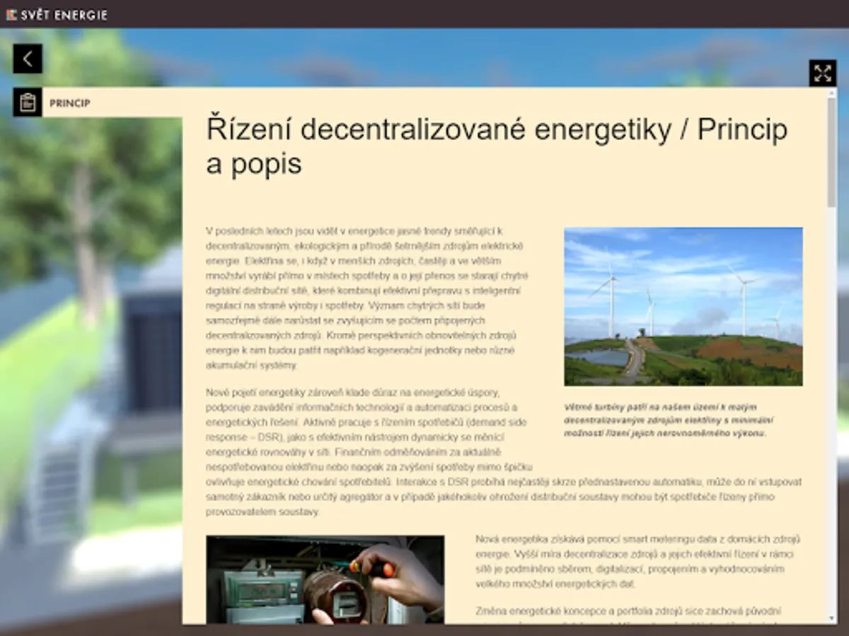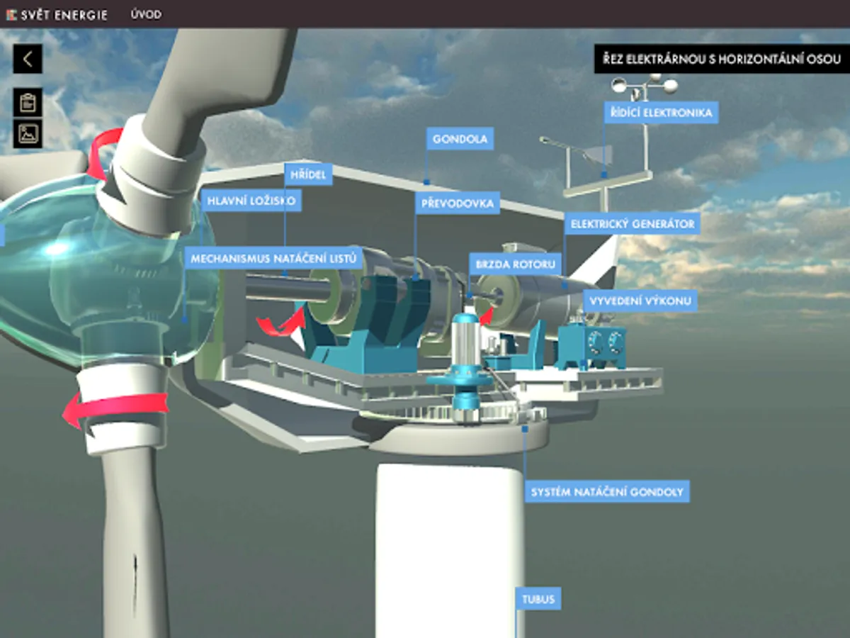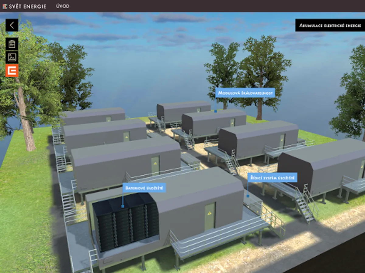 Getting to know decentralized energy begins by looking at a 3D model of part of the landscape with highlighted objects that make up small power generating units, or have some relation to a modern decentralized energy system. By panning, rotating, and zooming in on the scene, you can view the landscape of objects from any perspective from the perspective of a flying drone. Significant objects allow nesting into new scenes with detailed 3D models of the device, other complementary objects contain only a brief explanatory description. In the detailed view, another text-visual information level of the application is available, which besides describing the meaning, construction and types of the selected source also offers a number of illustrative photographs.