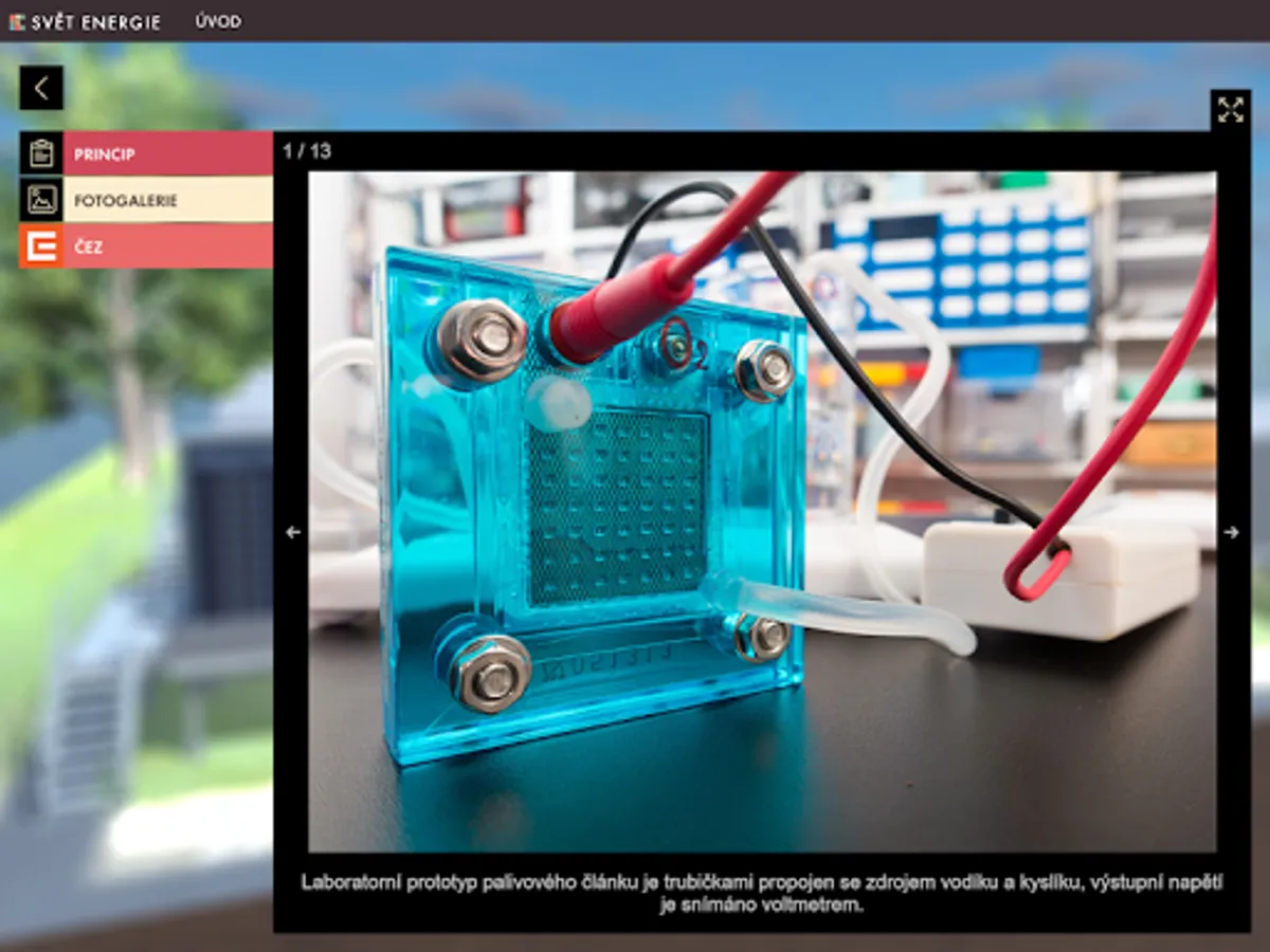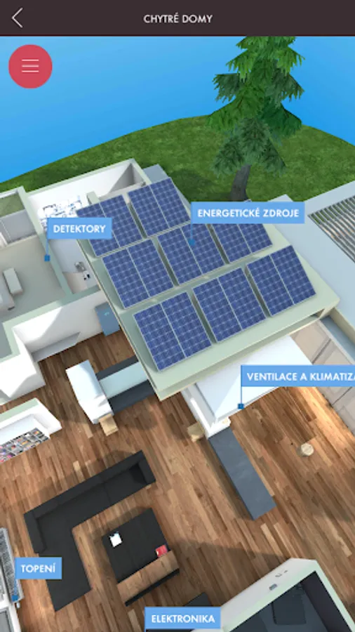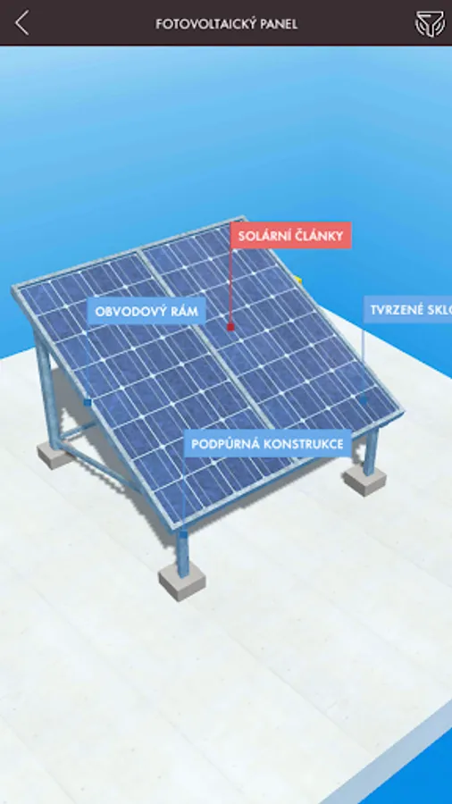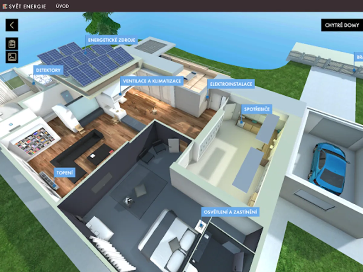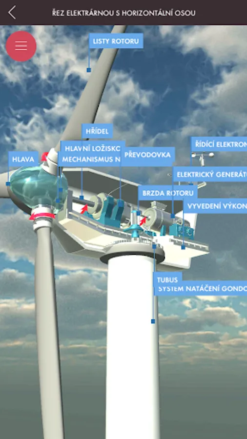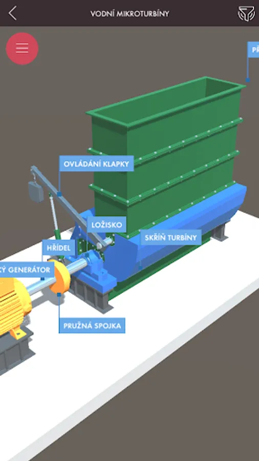 Getting to know decentralized energy begins by looking at a 3D model of part of the landscape with highlighted objects that make up small power generating units, or have some relation to a modern decentralized energy system. By panning, rotating, and zooming in on the scene, you can view the landscape of objects from any perspective from the perspective of a flying drone. Significant objects allow nesting into new scenes with detailed 3D models of the device, other complementary objects contain only a brief explanatory description. In the detailed view, another text-visual information level of the application is available, which besides describing the meaning, construction and types of the selected source also offers a number of illustrative photographs.