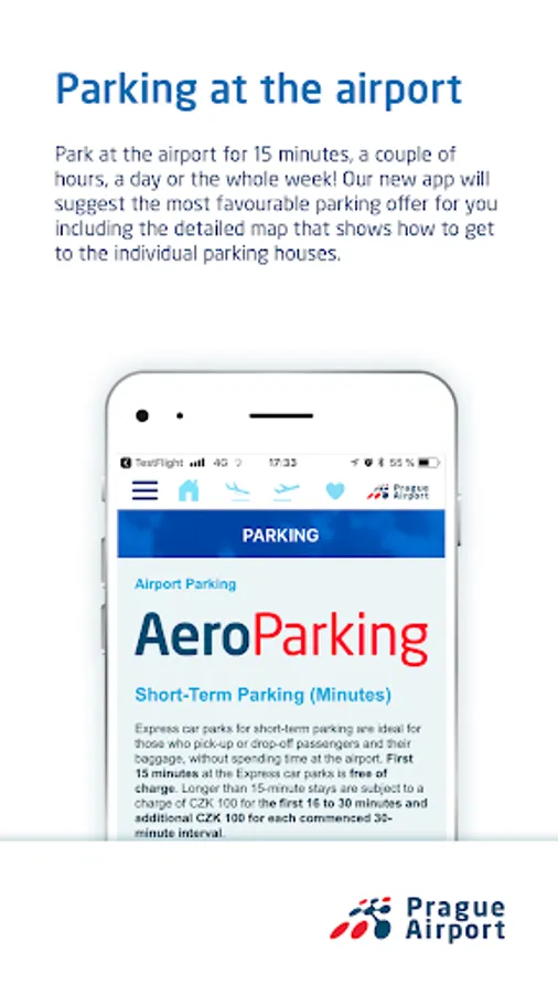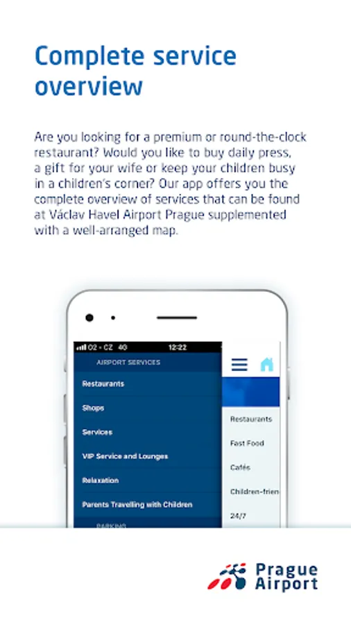 The mobile application will also provide you with information about the parking options available directly at Václav Havel Airport Prague, ways of check-in and additional services, including a complete list of the shops and restaurants you can visit at the airport. You will also find information about the airport lounges and VIP services.
