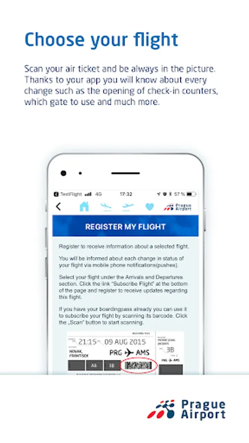 Scan the boarding pass barcode and register to receive information about your flight or the flight of your loved ones arriving at the airport. Thanks to mobile notifications, you will always have the selected flight’s data handy.
