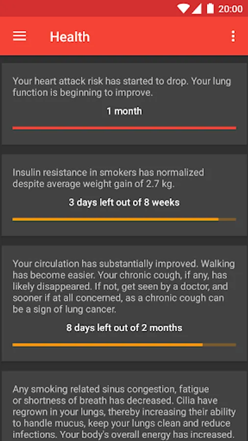 • Health benefits timetable, which shows you your fitness and health improvements during the time not smoking