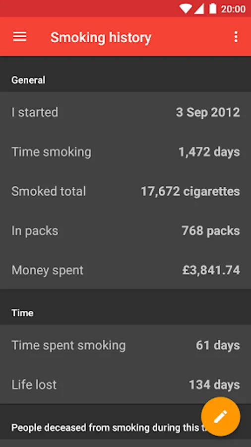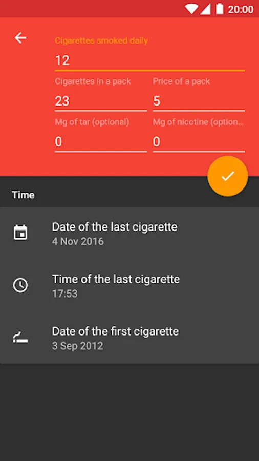 • History page where you will find, what you have sacrificed during the time you have been smoking cigarettes (tobacco)