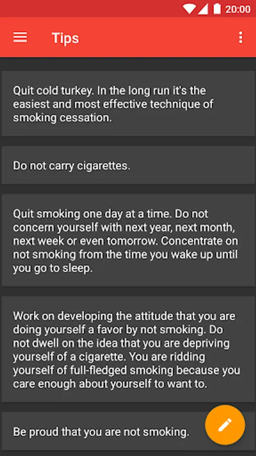 Fast and minimalistic material design application with gorgeous material animations whose aim is to help you to quit smoking. It calculates useful statistics and health benefits timetable for you which may help you drop that filthy habit.