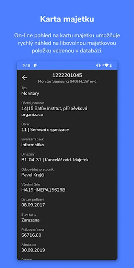 After entering the asset inventory number, or by reading a barcode or QR code, it is possible to display a list of basic information about the assets kept in the FaMa + system.