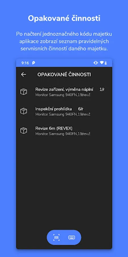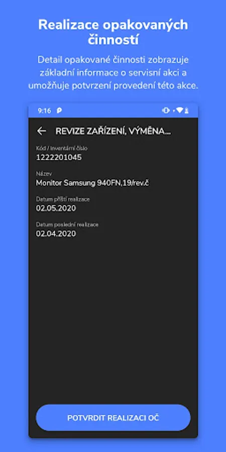 The functionality allows you to view all regular inspections and service activities for movable and immovable property. For selected service activities, their implementation can be confirmed directly in the application.